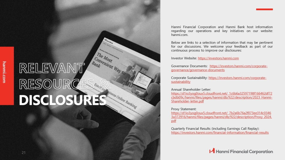 hanmi.com Hanmi Financial Corporation and Hanmi Bank host information regarding our operations and key initiatives on our website : hanmi . com . Below are links to a selection of information that may be pertinent for our discussions . We welcome your feedback as part of our continuous process to improve our disclosures : Investor Website : https : //investors . hanmi . com Governance Documents: https://investors.hanmi.com/corporate - governance/governance - documents Corporate Sustainability: https://investors.hanmi.com/corporate - sustainability Annual Shareholder Letter: https://d1io3yog0oux5.cloudfront.net/_1c6b6a32597198f166462df72 cbdb09c/hanmi/files/pages/hanmi/db/922/description/2023_Hanmi - Shareholder - letter.pdf Proxy Statement: https://d1io3yog0oux5.cloudfront.net/_7b2a6b76a2f073ee314c0346 3a372916/hanmi/files/pages/hanmi/db/922/description/Proxy_2024. pdf Quarterly Financial Results (including Earnings Call Replay): https://investors.hanmi.com/financial - information/financial - results 21