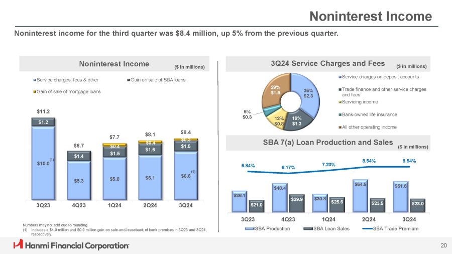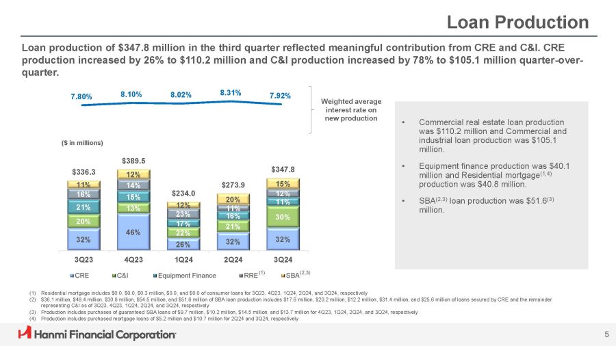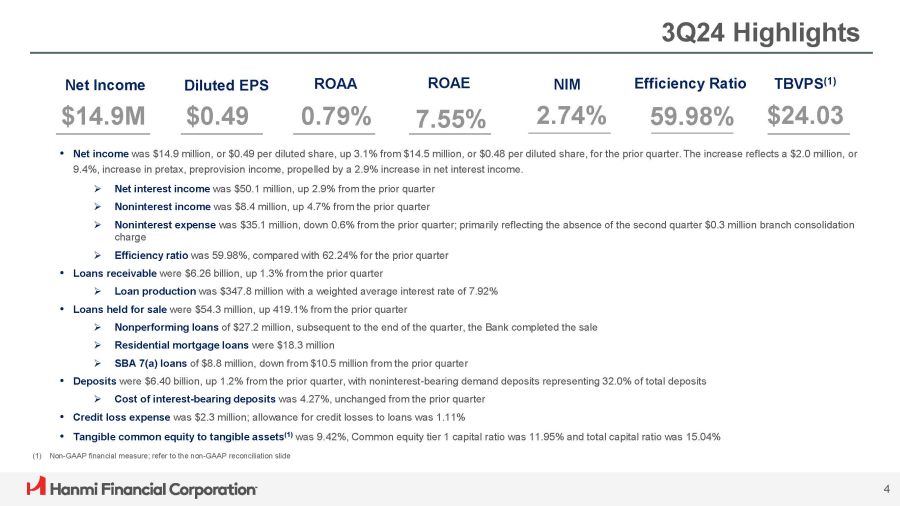 3Q24 Highlights Diluted EPS $0.49 ROAA 0.79% NIM 2.74% Efficiency Ratio 59.98% TBVPS (1) $24.03 Net Income $14.9M • Net income was $14.9 million, or $0.49 per diluted share, up 3.1% from $14.5 million, or $0.48 per diluted share, for the prior quarter. The increase reflects a $2.0 million, or 9.4%, increase in pretax, preprovision income, propelled by a 2.9% increase in net interest income. » Net interest income was $50.1 million, up 2.9% from the prior quarter » Noninterest income was $8.4 million, up 4.7% from the prior quarter » Noninterest expense was $35.1 million, down 0.6% from the prior quarter; primarily reflecting the absence of the second quarter $0.3 million branch consolidation charge » Efficiency ratio was 59.98%, compared with 62.24% for the prior quarter • Loans receivable were $6.26 billion, up 1.3% from the prior quarter » Loan production was $347.8 million with a weighted average interest rate of 7.92% • Loans held for sale were $54.3 million, up 419.1% from the prior quarter » Nonperforming loans of $27.2 million, subsequent to the end of the quarter, the Bank completed the sale » Residential mortgage loans were $18.3 million » SBA 7(a) loans of $8.8 million, down from $10.5 million from the prior quarter • Deposits were $6.40 billion, up 1.2% from the prior quarter, with noninterest - bearing demand deposits representing 32.0% of total deposits » Cost of interest - bearing deposits was 4.27%, unchanged from the prior quarter • Credit loss expense was $2.3 million; allowance for credit losses to loans was 1.11% • Tangible common equity to tangible assets (1) was 9.42%, Common equity tier 1 capital ratio was 11.95% and total capital ratio was 15.04% (1) Non - GAAP financial measure; refer to the non - GAAP reconciliation slide ROAE 7.55% 4