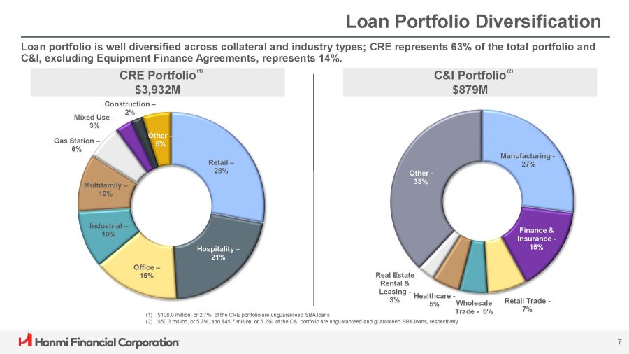 Loan Portfolio Commercial Real Estate (CRE) (1,2) Portfolio $3,932 Outstanding ($ in millions) 5.68% 3Q24 Average Yield $6.26 Billion Loan Portfolio (as of September 30, 2024) CRE 6 Owner - 13% CRE Multifamily - 7% CRE Construction - 1% C&I - 14% Equipment Finance - 8% CRE (2) Multifamily 149 # of Loans 54.6% Weighted Average Loan - to - Value Ratio (4) 1.58x Weighted Average Debt Coverage Ratio (4) CRE (2) Investor (non - owner) 865 # of Loans 49.4% Weighted Average Loan - to - Value Ratio (4) 2.04x Weighted Average Debt Coverage Ratio (4) CRE (2) Owner Occupied 718 # of Loans 47.5% Weighted Average Loan - to - Value Ratio (4) 2.73x Weighted Average Debt Coverage Ratio (4) Residential Real Estate (RRE) (3) Portfolio $939 Outstanding ($ in millions) 5.19% 3Q24 Average Yield Commercial & Industrial (C&I) (1) Portfolio $879 Outstanding ($ in millions) 8.57% 3Q24 Average Yield Equipment Finance Portfolio $507 Outstanding ($ in millions) 6.18% 3Q24 Average Yield Note: Numbers may not add due to rounding (1) Includes syndicated loans of $278.2 million in total commitments ($228.3 million disbursed) across C&I ($214.3 million committed and $164.4 million disbursed) and CRE ($63.9 million committed and disbursed) (2) Commercial Real Estate (CRE) is a combination of Investor (non - owner), Owner Occupied, Multifamily, and Construction. Investor (or non - owner occupied) property is where the investor does not occupy the property. The primary source of repayment stems from the rental income associated with the respective properties. Owner occupied property is where the borrower owns the property and also occupies it. The primary source of repayment is the cash flow from the ongoing operations and activities conducted by the borrower/owner. Multifamily real estate is a residential property that has 5 or more housing units. (3) Residential real estate is a loan (mortgage) secured by a single family residence, including one to four units (duplexes, triplexes, and fourplexes). RRE also includes $1.5 million of HELOCs and $8.3 million in consumer loans (4) Weighted average DCR and weighted average LTV calculated when the loan was first underwritten or renewed subsequently (5) $80.4 million, or 19.0%, of the CRE multifamily loans are rent - controlled in New York City (2) (2,5) (2) CRE Investor (non - owner) (2) - 42% (3) RRE - 15%