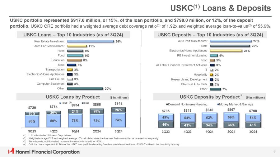 USKC (1) Loans & Deposits 26% 11% 9% 9% 8% 5% 3% 3% 3% 3% 20% Real Estate Investment Auto Part Manufacturer Hotel Food Education Steel Transportation Electronics/Home Appliances Golf Course Computer Equipment Other USKC portfolio represented $917.6 million, or 15%, of the loan portfolio, and $798.0 million, or 12%, of the deposit portfolio. USKC CRE portfolio had a weighted average debt coverage ratio (2) of 1.92x and weighted average loan - to - value (2) of 55.9%. USKC Loans – Top 10 Industries (as of 3Q24) 80% 80% 74% $720 20% $764 20% $918 26% C&I $865 CRE (4) $834 28% 24% 72% 76% 3Q23 4Q23 1Q24 2Q24 3Q24 USKC Loans by Product ($ in millions) USKC Deposits – Top 10 Industries (as of 3Q24) 27% Auto Part Manufacurer 26% Steel 21% Electronics/Home Appliances 5% RE Investment/Leasing 3% Food 3% All Other Financial Investment Activities 2% IT 2% Hospitality 2% Research and Development 2% Electrical Auto Parts 7% Other 41% 34% 36% 54% 62% 59% $795 49% 46% $819 $848 $867 $798 54% 41% 3Q23 4Q23 1Q24 2Q24 3Q24 Demand Noninterest - bearing Money Market & Savings 11 USKC Deposits by Product (3) ($ in millions) (1) U.S. subsidiaries of Korean Corporations (2) Weighted average DCR and weighted average LTV calculated when the loan was first underwritten or renewed subsequently (3) Time deposits, not illustrated, represent the remainder to add to 100%. (4) Criticized loans represent 11.96% of the USKC loan portfolio stemming from two special mention loans of $109.7 million in the hospitality industry