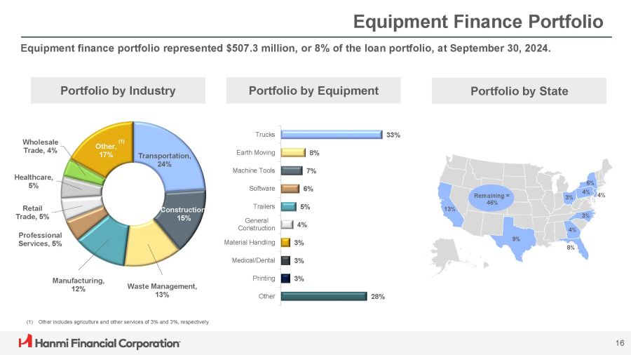 Equipment Finance Portfolio Equipment finance portfolio represented $507.3 million, or 8% of the loan portfolio, at September 30, 2024. Transportation, 24% Construction 15% Waste Management, 13% Manufacturing, 12% Professional Services, 5% Retail Trade, 5% Healthcare, 5% Wholesale Trade, 4% (1) Other, 17% 33% 8% 7% 6% 5% 4% 3% 3% 3% 28% Trucks Earth Moving Machine Tools Software Trailers General Construction Material Handling Medical/Dental Printing Other Portfolio by Industry Portfolio by Equipment Portfolio by State 13% 16 9% 4% 8% 6% 4% 3% 3% Remaining = 46% 4% (1) Other includes agriculture and other services of 3% and 3%, respectively