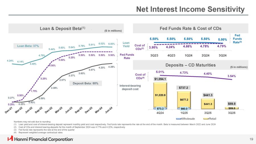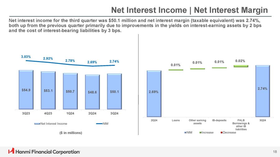 Net Interest Income | Net Interest Margin Net interest income for the third quarter was $ 50 . 1 million and net interest margin (taxable equivalent) was 2 . 74 % , both up from the previous quarter primarily due to improvements in the yields on interest - earning assets by 2 bps and the cost of interest - bearing liabilities by 3 bps . ($ in millions) 2.69% 0.01% 0.01% 0.01% 0.02% 2.74% 2Q24 Loans Other earning assets IB - deposits FHLB Borrowings & other IB liabilities Decrease 3Q24 NIM Increase $54.9 $53.1 $50.7 $48.6 $50.1 3.03% 2.92% 2.78% 2.69% 2.74% 3Q23 4Q23 1Q24 2Q24 3Q24 Net Interest Income NIM 18