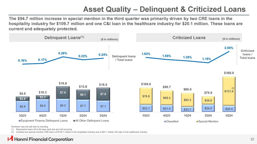 Asset Quality – Gross & Net Loan Charge - offs Gross Charge - offs Net Charge - offs Net Charge - offs / Average loans Net charge - offs for the third quarter were $0.9 million. ($ in millions) ($ in millions) $2.8 $1.8 $2.0 $2.1 $2.5 $6.6 $1.3 $9.4 $1.8 $2.1 $0.1 $2.3 $0.2 $3.8 3Q23 4Q23 1Q24 Equipment Finance Charge - offs 2Q24 3Q24 All Other Loan Charge - offs Note: Numbers may not add due to rounding $2.5 $1.2 $1.6 $1.8 $2.0 $6.4 ($6.2) ($1.1) $8.9 $1.6 $1.8 $0.9 0.60% - 0.33% 0.10% 0.12% 0.06% ($5.0) 4Q23 1Q24 3Q23 2Q24 3Q24 All Other Net Charge - offs Equipment Finance Net Charge - offs 24