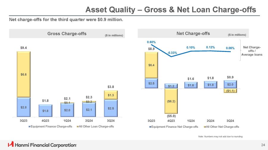 $15.8 $15.5 $14.0 $19.2 $15.5 $0.1 $0.1 $0.1 $15.9 $15.6 $14.1 $20.0 3Q23 4Q23 1Q24 Nonperforming loans 2Q24 3Q24 OREO Asset Quality – Nonperforming Assets & Nonaccrual Loans 0.22% 0.21% 0.19% 0.26% 0.21% Nonperforming assets / Total assets Nonperforming Assets (1) Nonaccrual Loans Nonperforming assets were $16.3 million at the end of the third quarter, down from $20.0 million at the end of the second quarter. ($ in millions) ($ in millions) Note: Numbers may not add due to rounding (1) Nonperforming assets exclude repossessed personal property of $1.3 million, $1.3 million, $1.3 million, $1.2 million, and $1.2 million for September 30, 2023, December 31, 2023, March 31, 2024, June 30, 2024, and September 30, 2024, respectively; also excludes the $27.2 million held for sale nonperforming loan at September 30, 2024 (2) Specific allowance for credit losses at September 30, 2023, December 31, 2023, March 31, 2024, June 30, 2024, and September 30, 2024 was $2.9 million, $3.4 million, $5.3 million, $6.8 million, and $5.2 million, respectively (3) RRE includes consumer loans $7.9 $7.3 $6.9 $8.6 $9.6 $4.9 $4.9 $16.3 $0.8 $3.3 $3.0 $0.8 $15.8 $15.5 $15.2 $3.7 $1.9 $3.9 (2) $14.0 $5.9 $3.9 $0.8 $3.2 $19.2 3Q23 4Q23 Equipment Finance 1Q24 2Q24 3Q24 RRE All other CRE and C&I < $3M All other CRE and C&I >= $3M 23 (3) (2) (2) (2) (2)