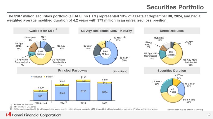 ACL Analysis by Loan Type September 30, 2023 December 31, 2023 March 31, 2024 June 30, 2024 September 30, 2024 ($ in millions) Loans Allowance Loans Allowance Loans Allowance Loans Allowance Loans Allowance $ 3,773.0 $ 38.9 $ 3,889.7 $ 40.2 $ 3,878.5 $ 36.4 $ 3,888.5 $ 36.1 $ 3,932.1 $ 37.8 CRE 728.8 11.2 747.8 10.3 774.9 11.8 802.4 10.6 879.1 9.8 C&I 592.7 12.3 582.2 13.7 554.0 13.7 531.3 15.0 507.3 15.7 Equipment Finance 926.3 4.9 962.7 5.3 970.4 6.2 954.2 6.0 939.3 5.9 RRE & Consumer $ 6,020.8 $ 67.3 $ 6,182.4 $ 69.5 $ 6,177.8 $ 68.3 $ 6,176.4 $ 67.7 $ 6,257.7 $ 69.2 Total Note: Numbers may not add due to rounding 26