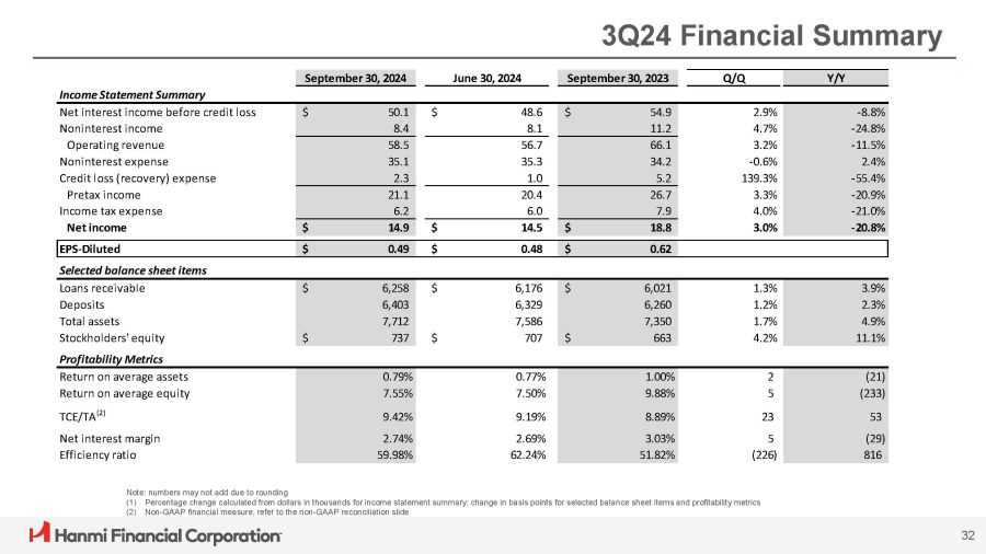 Hanmi Financial Corporation (the “Company”) cautions investors that any statements contained herein that are not historical facts are forward - looking statements within the meaning of the “safe harbor” provisions of the Private Securities Litigation Reform Act of 1995 , including, but not limited to, those statements regarding operating and financial performance, financial position and liquidity, business strategies, regulatory, economic and competitive outlook, investment and expenditure plans, capital and financing needs and availability, litigation, plans and objectives, merger or sale activity, financial condition and results of operations, and all other forecasts and statements of expectation or assumption underlying any of the foregoing . These statements involve known and unknown risks and uncertainties that are difficult to predict . Investors should not rely on any forward - looking statement and should consider risks, such as changes in governmental policy, legislation and regulations, economic uncertainty and changes in economic conditions, inflation, fluctuations in interest rate and credit risk, competitive pressures, our ability to access cost - effective funding, the ability to enter into new markets successfully and capitalize on growth opportunities, balance sheet management, liquidity and sources of funding, the size and composition of our deposit portfolio, and including the percentage of uninsured deposits in the portfolio, increased assessments by the Federal Deposit Insurance Corporation, risk of natural disasters, a failure in or breach of our operational or security systems or infrastructure, including cyberattacks, the adequacy of and changes in the methodology of calculating our allowance for credit losses, and other operational factors . Forward - looking statements are based upon the good faith beliefs and expectations of management as of this date only and are further subject to additional risks and uncertainties, including, but not limited to, the risk factors set forth in our earnings release dated October 22 , 2024 , including the section titled “Forward Looking Statements” and the Company’s most recent Form 10 - K, 10 - Q and other filings with the Securities and Exchange Commission (“SEC”) . The Company disclaims any obligation to update or revise the forward - looking statements herein . 2 Forward - Looking Statements