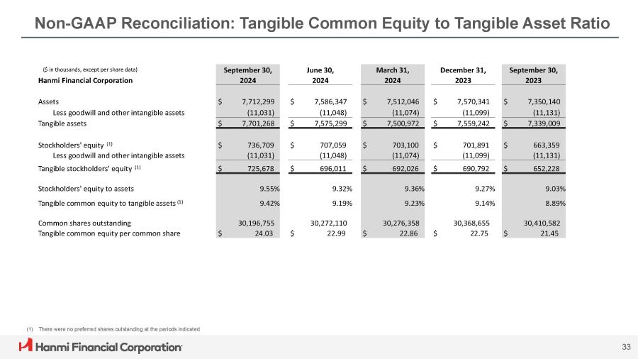 Non - GAAP Reconciliation: Tangible Common Equity to Tangible Asset Ratio 33 (1) There were no preferred shares outstanding at the periods indicated September 30, December 31, March 31, June 30, September 30, ($ in thousands, except per share data) 2023 2023 2024 2024 2024 Hanmi Financial Corporation $ 7,350,140 $ 7,570,341 $ 7,512,046 $ 7,586,347 $ 7,712,299 Assets (11,131) (11,099) (11,074) (11,048) (11,031) Less goodwill and other intangible assets $ 7,339,009 $ 7,559,242 $ 7,500,972 $ 7,575,299 $ 7,701,268 Tangible assets $ 663,359 $ 701,891 $ 703,100 $ 707,059 $ 736,709 Stockholders' equity (1) (11,131) (11,099) (11,074) (11,048) (11,031) Less goodwill and other intangible assets $ 652,228 $ 690,792 $ 692,026 $ 696,011 $ 725,678 Tangible stockholders' equity (1) 9.03% 9.27% 9.36% 9.32% 9.55% Stockholders' equity to assets 8.89% 9.14% 9.23% 9.19% 9.42% Tangible common equity to tangible assets (1) 30,410,582 30,368,655 30,276,358 30,272,110 30,196,755 Common shares outstanding $ 21.45 $ 22.75 $ 22.86 $ 22.99 $ 24.03 Tangible common equity per common share