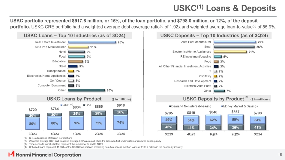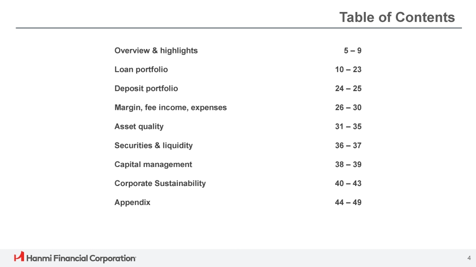 Hanmi Financial Corporation (the “Company”) cautions investors that any statements contained herein that are not historical facts are forward - looking statements within the meaning of the “safe harbor” provisions of the Private Securities Litigation Reform Act of 1995 , including, but not limited to, those statements regarding operating and financial performance, financial position and liquidity, business strategies, regulatory, economic and competitive outlook, investment and expenditure plans, capital and financing needs and availability, litigation, plans and objectives, merger or sale activity, financial condition and results of operations, and all other forecasts and statements of expectation or assumption underlying any of the foregoing . These statements involve known and unknown risks and uncertainties that are difficult to predict . Investors should not rely on any forward - looking statement and should consider risks, such as changes in governmental policy, legislation and regulations, economic uncertainty and changes in economic conditions, inflation, fluctuations in interest rate and credit risk, competitive pressures, our ability to access cost - effective funding, the ability to enter into new markets successfully and capitalize on growth opportunities, balance sheet management, liquidity and sources of funding, the size and composition of our deposit portfolio, and including the percentage of uninsured deposits in the portfolio, increased assessments by the Federal Deposit Insurance Corporation, risk of natural disasters, a failure in or breach of our operational or security systems or infrastructure, including cyberattacks, the adequacy of and changes in the methodology of calculating our allowance for credit losses, and other operational factors . Forward - looking statements are based upon the good faith beliefs and expectations of management as of this date only and are further subject to additional risks and uncertainties, including, but not limited to, the risk factors set forth in our earnings release dated October 22 , 2024 , including the section titled “Forward Looking Statements” and the Company’s most recent Form 10 - K, 10 - Q and other filings with the Securities and Exchange Commission (“SEC”) . The Company disclaims any obligation to update or revise the forward - looking statements herein . 2 Forward - Looking Statements