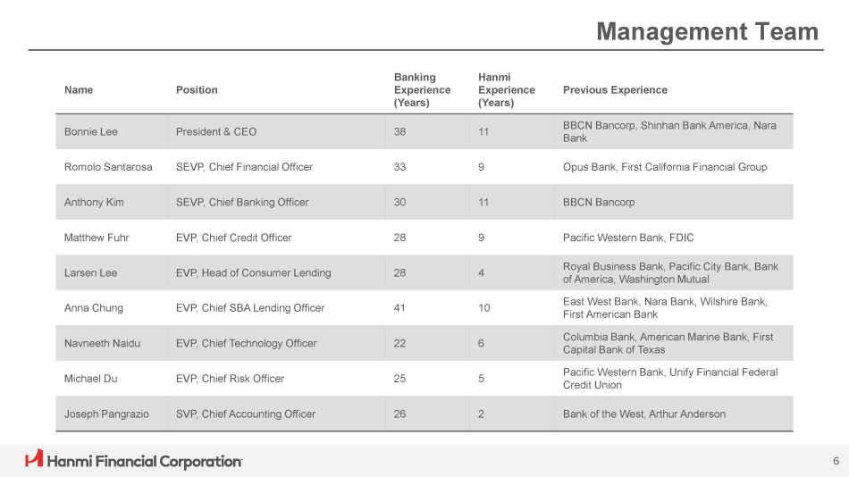 Previous Experience Hanmi Experience (Years) Banking Experience (Years) Position Name BBCN Bancorp, Shinhan Bank America, Nara Bank 11 38 President & CEO Bonnie Lee Opus Bank, First California Financial Group 9 33 SEVP, Chief Financial Officer Romolo Santarosa BBCN Bancorp 11 30 SEVP, Chief Banking Officer Anthony Kim Pacific Western Bank, FDIC 9 28 EVP, Chief Credit Officer Matthew Fuhr Royal Business Bank, Pacific City Bank, Bank of America, Washington Mutual 4 28 EVP, Head of Consumer Lending Larsen Lee East West Bank, Nara Bank, Wilshire Bank, First American Bank 10 41 EVP, Chief SBA Lending Officer Anna Chung Columbia Bank, American Marine Bank, First Capital Bank of Texas 6 22 EVP, Chief Technology Officer Navneeth Naidu Pacific Western Bank, Unify Financial Federal Credit Union 5 25 EVP, Chief Risk Officer Michael Du Bank of the West, Arthur Anderson 2 26 SVP, Chief Accounting Officer Joseph Pangrazio 6 Management Team