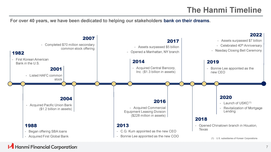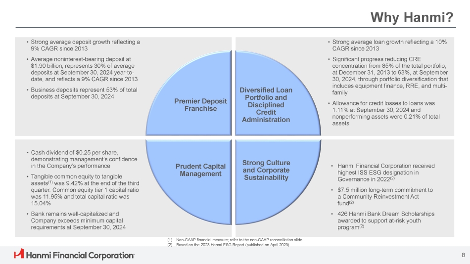 The Hanmi Timeline 1982 - First Korean American Bank in the U.S. 1988 - Began offering SBA loans - Acquired First Global Bank 2001 - Listed HAFC common stock 2004 - Acquired Pacific Union Bank ($1.2 billion in assets) 2007 - Completed $70 million secondary common stock offering 2013 - C.G. Kum appointed as the new CEO - Bonnie Lee appointed as the new COO 2014 - Acquired Central Bancorp, Inc. ($1.3 billion in assets) 2016 - Acquired Commercial Equipment Leasing Division ($228 million in assets) 2017 - Assets surpassed $5 billion - Opened a Manhattan, NY branch 2019 - Bonnie Lee appointed as the new CEO 2022 - Assets surpassed $7 billion - Celebrated 40 th Anniversary - Nasdaq Closing Bell Ceremony For over 40 years, we have been dedicated to helping our stakeholders bank on their dreams . 7 2020 - Launch of USKC (1) - Revitalization of Mortgage Lending (1) U.S. subsidiaries of Korean Corporations 2018 - Opened Chinatown branch in Houston, Texas