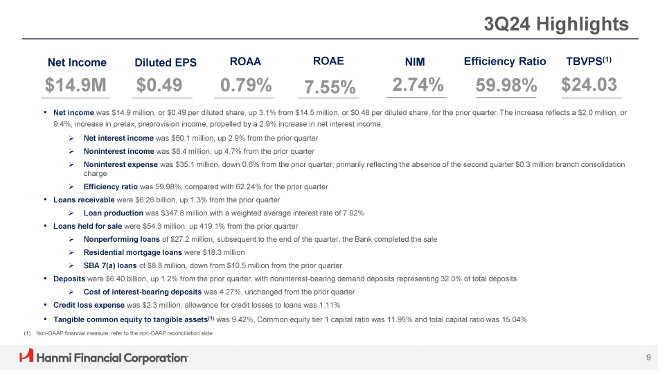Why Hanmi? • Strong average loan growth reflecting a 10% CAGR since 2013 • Significant progress reducing CRE concentration from 85% of the total portfolio, at December 31, 2013 to 63%, at September 30 , 2024 , through portfolio diversification that includes equipment finance, RRE, and multi - family • Allowance for credit losses to loans was 1.11% at September 30, 2024 and nonperforming assets were 0.21% of total assets • Strong average deposit growth reflecting a 9% CAGR since 2013 • Average noninterest - bearing deposit at $1.90 billion, represents 30% of average deposits at September 30, 2024 year - to - date, and reflects a 9% CAGR since 2013 • Business deposits represent 53% of total deposits at September 30, 2024 Premier Deposit Franchise Diversified Loan Portfolio and Disciplined Credit Administration 8 Strong Culture and Corporate Sustainability Prudent Capital Management • Cash dividend of $0.25 per share, demonstrating management’s confidence in the Company’s performance • Tangible common equity to tangible assets (1) was 9.42% at the end of the third quarter. Common equity tier 1 capital ratio was 11.95% and total capital ratio was 15.04% • Bank remains well - capitalized and Company exceeds minimum capital requirements at September 30, 2024 • Hanmi Financial Corporation received highest ISS ESG designation in Governance in 2022 (2) • $7.5 million long - term commitment to a Community Reinvestment Act fund (2) • 426 Hanmi Bank Dream Scholarships awarded to support at - risk youth program (2) (1) Non - GAAP financial measure; refer to the non - GAAP reconciliation slide (2) Based on the 2023 Hanmi ESG Report (published on April 2023)
