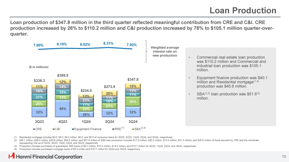3Q24 Highlights Diluted EPS $0.49 ROAA 0.79% NIM 2.74% Efficiency Ratio 59.98% TBVPS (1) $24.03 Net Income $14.9M • Net income was $14.9 million, or $0.49 per diluted share, up 3.1% from $14.5 million, or $0.48 per diluted share, for the prior quarter. The increase reflects a $2.0 million, or 9.4%, increase in pretax, preprovision income, propelled by a 2.9% increase in net interest income. » Net interest income was $50.1 million, up 2.9% from the prior quarter » Noninterest income was $8.4 million, up 4.7% from the prior quarter » Noninterest expense was $35.1 million, down 0.6% from the prior quarter; primarily reflecting the absence of the second quarter $0.3 million branch consolidation charge » Efficiency ratio was 59.98%, compared with 62.24% for the prior quarter • Loans receivable were $6.26 billion, up 1.3% from the prior quarter » Loan production was $347.8 million with a weighted average interest rate of 7.92% • Loans held for sale were $54.3 million, up 419.1% from the prior quarter » Nonperforming loans of $27.2 million, subsequent to the end of the quarter, the Bank completed the sale » Residential mortgage loans were $18.3 million » SBA 7(a) loans of $8.8 million, down from $10.5 million from the prior quarter • Deposits were $6.40 billion, up 1.2% from the prior quarter, with noninterest - bearing demand deposits representing 32.0% of total deposits » Cost of interest - bearing deposits was 4.27%, unchanged from the prior quarter • Credit loss expense was $2.3 million; allowance for credit losses to loans was 1.11% • Tangible common equity to tangible assets (1) was 9.42%, Common equity tier 1 capital ratio was 11.95% and total capital ratio was 15.04% (1) Non - GAAP financial measure; refer to the non - GAAP reconciliation slide ROAE 7.55% 9
