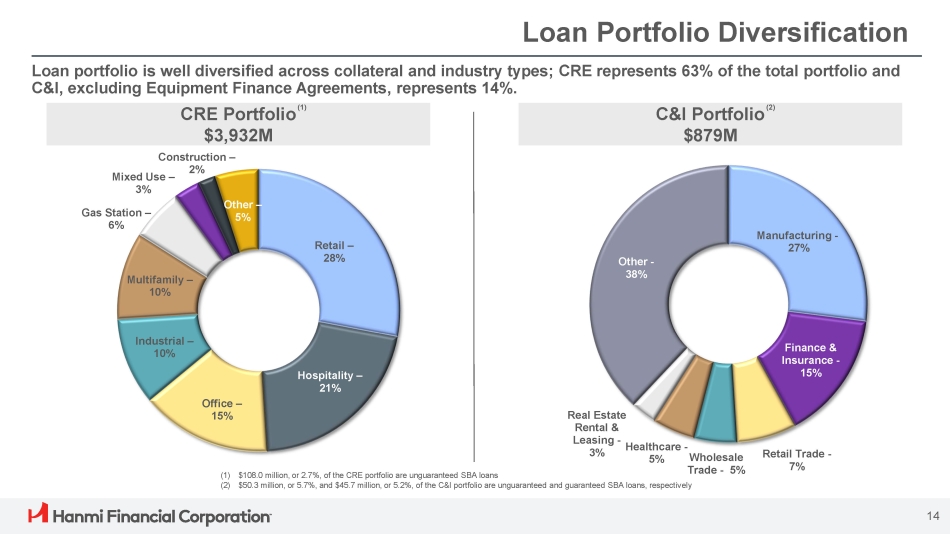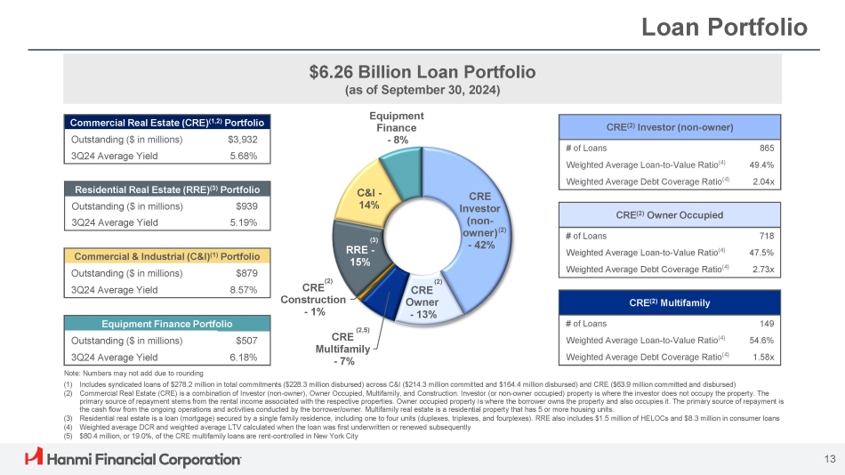 Successful Portfolio Diversification Strategy 12 Loan Composition (as of September 30, 2024) Loan Composition (as of December 31, 2013) $2.23 Billion $6.26 Billion (1) RRE includes Consumer loans (2) $144.5 million or 7.6% and $108.0 million or 2.7% of the CRE portfolio is unguaranteed SBA loans at December 31, 2013 and September 30, 2024, respectively (3) $7.0 million or 3.1% and $50.3 million or 5.7% of the C&I portfolio is unguaranteed SBA loans at December 31, 2013 and September 30, 2024, respectively RRE – 15% Equipment Finance – 8% (1) RRE – 5% Significant progress reducing CRE concentration from 85% of total portfolio to 63%. (1) (2) CRE – 63% C&I (3 – ) 14% (2) CRE – 85% (3) C&I – 10%