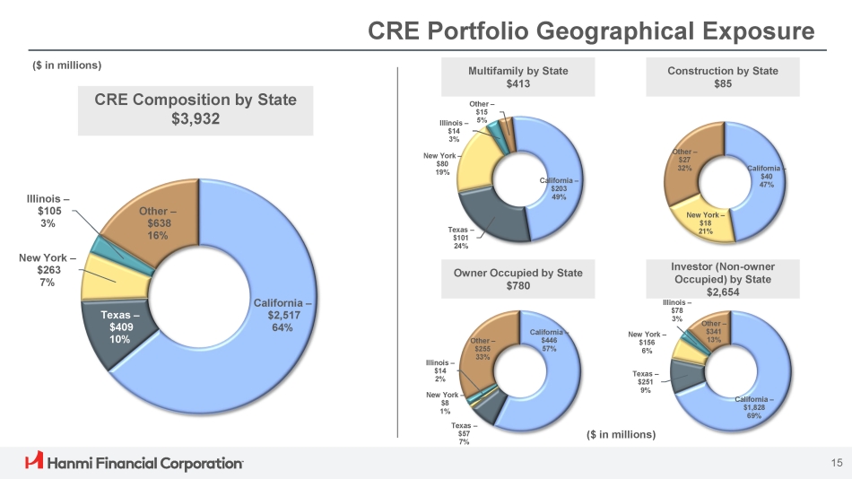 Loan Portfolio Diversification Loan portfolio is well diversified across collateral and industry types; CRE represents 63% of the total portfolio and C&I, excluding Equipment Finance Agreements, represents 14%. CRE Portfolio (1) $3,932M C&I Portfolio (2) $879M Retail – 28% Hospitality – 21% Office – 15% Industrial – 10% Multifamily – 10% Gas Station – 6% Mixed Use – 3% Construction – 2% Other – 5% Manufacturing - 27% 14 Finance & Insurance - 15% Retail Trade - 7% Wholesale Trade - 5% 5% Real Estate Rental & Leasing - Healthcare - 3% Other - 38% (1) $108.0 million, or 2.7%, of the CRE portfolio are unguaranteed SBA loans (2) $50.3 million, or 5.7%, and $45.7 million, or 5.2%, of the C&I portfolio are unguaranteed and guaranteed SBA loans, respectively