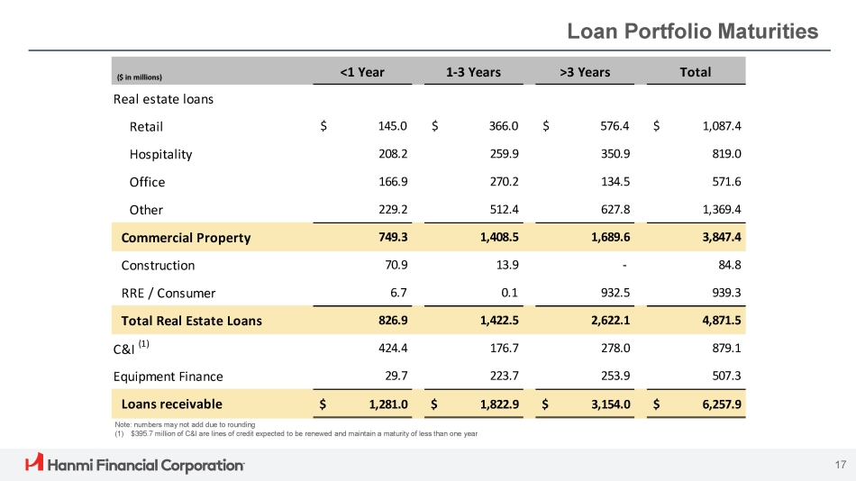 Loan Portfolio Distribution CRE C&I ($ in millions) ($ in millions) Construction (1) Multifamily Non - owner Occupied Owner Occupied $85 $413 $2,654 $780 Total Balance $7.71 $2.77 $3.07 $1.09 Average $2.64 $1.10 $1.11 $0.34 Median $49 $298 $1,904 $589 (3) Top Quintile Balance $15.6 or more $2.6 or more $3.7 or more $1.2 or more Top Quintile Loan Size $24.73 $9.95 $11.13 $4.12 Top Quintile Average $24.73 $4.73 $7.00 $2.24 Top Quintile Median Lines of Credit (2) Term (2) $502 $378 Total Balance $0.90 $0.34 Average $0.15 $0.06 Median $416 $327 (3) Top Quintile Balance $0.9 or more $0.2 or more Top Quintile Loan Size $5.40 $1.51 Top Quintile Average $2.29 $0.36 Top Quintile Median Residential Real Estate & Equipment Finance 16 Equipment Finance Residential Real Estate $507 $939 Total Balance $0.04 $0.53 Average $0.03 $0.45 Median $259 $400 Top Quintile Balance (3) $0.1 or more $0.7 or more Top Quintile Loan Size $0.12 $1.14 Top Quintile Average $0.10 $0.91 Top Quintile Median ($ in millions) (1) Represents the total outstanding amount. Advances require authorization and disbursement requests, depending on the progress of the project and inspections. Advances are non - revolving and are made throughout the term, up to the original commitment amount (2) Term loans are a commitment for a specified term. Majority of the Lines of Credit are revolving, including commercial revolvers, with some non - revolvers (sub - notes and working capital tranches) (3) Top quintile represents top 20% of the loans