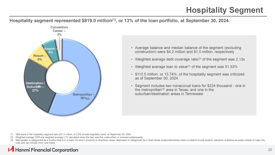 Office Loan Portfolio The CRE office portfolio (1) was $571.6 million (2) at September 30, 2024, representing 9% of the total loan portfolio. 81% 12% 3% Remaining = 3% 1% Portfolio by State • Average balance and median balance of the portfolio were $ 4 . 4 million and $ 1 . 09 million, respectively • Weighted average debt coverage ratio (3) of the segment was 2.02x • Weighted average loan to value (3) of the segment was 55.71% • 23.5% of the portfolio is expected to reprice in 1 to 3 months • Delinquent loans represented 0.14% of the office portfolio • Criticized loans represented 1.52% of the office portfolio Rate Distribution (1) Segment represents exposure in CRE and excludes $18 million in construction. 7.7% of the portfolio is owner occupied (2) SBA CRE office loans were $7.3 million, or 1.3% of total office loans, at September 30, 2024 (3) Weighted average DCR and weighted average LTV calculated when the loan was first underwritten or renewed subsequently 65% 35% Fixed Variable 19