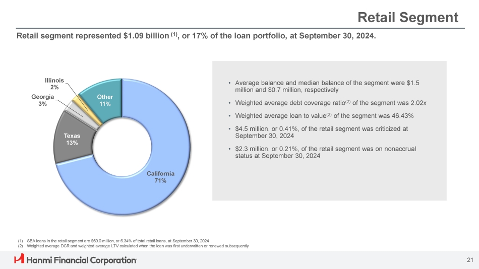 Retail Segment Retail segment represented $1.09 billion (1) , or 17% of the loan portfolio, at September 30, 2024. (1) SBA loans in the retail segment are $69.0 million, or 6.34% of total retail loans, at September 30, 2024 (2) Weighted average DCR and weighted average LTV calculated when the loan was first underwritten or renewed subsequently • Average balance and median balance of the segment were $1.5 million and $0.7 million, respectively • Weighted average debt coverage ratio (2) of the segment was 2.02x • Weighted average loan to value (2) of the segment was 46.43% • $4.5 million, or 0.41%, of the retail segment was criticized at September 30, 2024 • $2.3 million, or 0.21%, of the retail segment was on nonaccrual status at September 30, 2024 California 71% 21 Texas 13% Illinois 2% Georgia 3% Other 11%