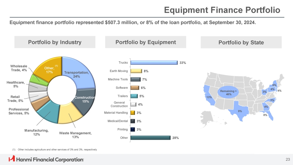 Equipment Finance Portfolio Equipment finance portfolio represented $507.3 million, or 8% of the loan portfolio, at September 30, 2024. Transportation, 24% Construction 15% Waste Management, 13% Manufacturing, 12% Professional Services, 5% Retail Trade, 5% Healthcare, 5% Wholesale Trade, 4% (1) Other, 17% 33% 8% 7% 6% 5% 4% 3% 3% 3% 28% Trucks Earth Moving Machine Tools Software Trailers General Construction Material Handling Medical/Dental Printing Other Portfolio by Industry Portfolio by Equipment Portfolio by State 13% 23 9% 4% 8% 6% 4% 3% 3% Remaining = 46% 4% (1) Other includes agriculture and other services of 3% and 3%, respectively