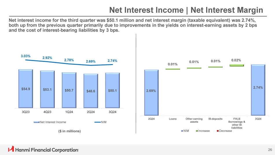 Net Interest Income | Net Interest Margin Net interest income for the third quarter was $ 50 . 1 million and net interest margin (taxable equivalent) was 2 . 74 % , both up from the previous quarter primarily due to improvements in the yields on interest - earning assets by 2 bps and the cost of interest - bearing liabilities by 3 bps . ($ in millions) 2.69% 0.01% 0.01% 0.01% 0.02% 2.74% 2Q24 Loans Other earning assets IB - deposits FHLB Borrowings & other IB liabilities Decrease 3Q24 NIM Increase $54.9 $53.1 $50.7 $48.6 $50.1 3.03% 2.92% 2.78% 2.69% 2.74% 3Q23 4Q23 1Q24 2Q24 3Q24 Net Interest Income NIM 26