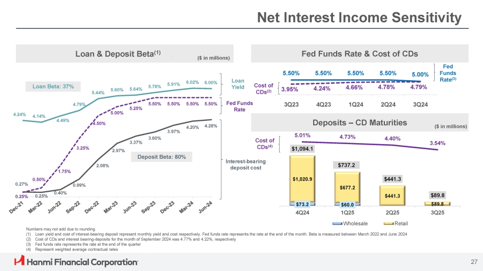 Net Interest Income Sensitivity Loan & Deposit Beta (1) . Fed Funds Rate & Cost of CDs $73.2 $60.0 $1,020.9 $677.2 $441.3 $89.8 $1,094.1 $737.2 $441.3 $89.8 5.01% 4.73% 4.40% 3.54% 4Q24 3Q25 1Q25 Wholesale 2Q25 Retail ($ in millions) 4Q23 1Q24 2Q24 Deposits – CD Maturities 5.50% 5.50% 5.50% 5.50% 5.00% 3.95% 4.24% 4.66% 4.78% 4.79% 3Q23 3Q24 Fed Funds Rate (3) Cost of CDs (2) ($ in millions) Cost of CDs (4) Numbers may not add due to rounding (1) Loan yield and cost of interest - bearing deposit represent monthly yield and cost respectively. Fed funds rate represents the rate at the end of the month. Beta is measured between March 2022 and June 2024 (2) Cost of CDs and interest bearing - deposits for the month of September 2024 was 4.77% and 4.22%, respectively (3) Fed funds rate represents the rate at the end of the quarter (4) Represent weighted average contractual rates 4.24% 4.14% 4.49% 4.79% 5.44% 5.60% 5.64% 5.78% 5.91% 6.02% 6.00% 0.27% 0.25% 0.40% 0.99% 2.08% 2.97% 3.37% 3.60% 3.97% 4.20% 4.28% 0.2 5 % 0.50% 1.75% 3.25% 4.50% 5.00% 5.25% 5.50% 5.50% 5.50% 5.50% Fed Funds Rate 27 Loan Yield Interest - bearing deposit cost Loan Beta: 37% Deposit Beta: 80%