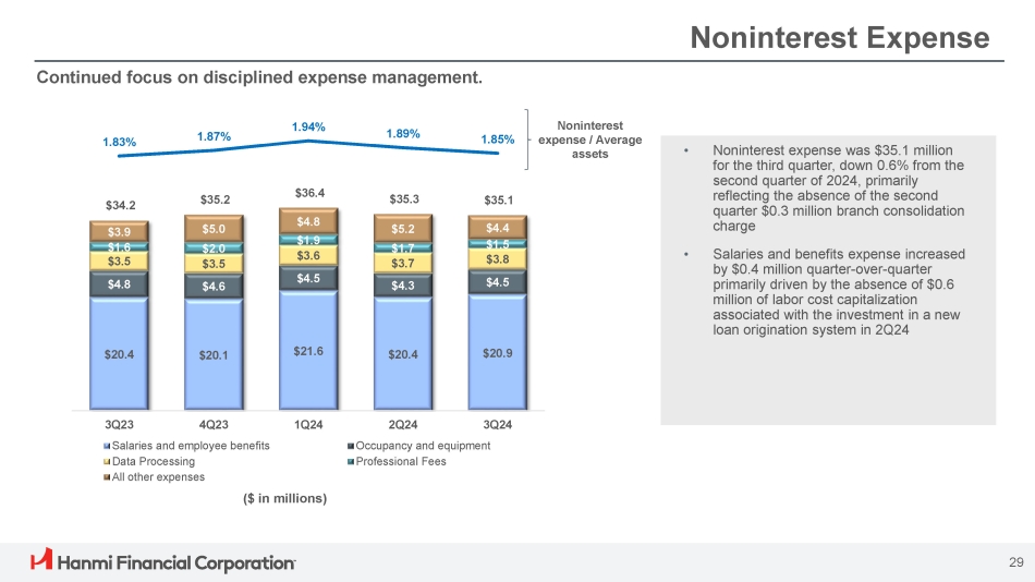 35% $2.3 12% 19% $0.8 $1.3 5% $0.3 29% $1.9 Service charges on deposit accounts Trade finance and other service charges and fees Servicing income Bank - owned life insurance All other operating income Noninterest Income SBA 7(a) Loan Production and Sales ($ in millions) $36.1 $48.4 $30.8 $54.5 $51.6 $21.0 $29.9 $25.6 $23.5 $23.0 6.84% 6.17% 7.23% 8.54% 8.54% 3Q23 4Q23 1Q24 SBA Loan Sales SBA Production 2Q24 3Q24 SBA Trade Premium Noninterest income for the third quarter was $8.4 million, up 5% from the previous quarter. Noninterest Income 3Q24 Service Charges and Fees ($ in millions) ($ in millions) $5.3 $5.8 $6.1 $6.6 $11.2 $1.2 $6.7 $1.4 $7.7 $0.4 $1.5 $8.1 $0.4 $1.6 $8.4 $0.3 $1.5 3Q23 4Q23 1Q24 2Q24 3Q24 (1) $10.0 Service charges, fees & other Gain on sale of SBA loans Gain of sale of mortgage loans Numbers may not add due to rounding (1) Includes a $4.0 million and $0.9 million gain on sale - and - leaseback of bank premises in 3Q23 and 3Q24, respectively. 28 (1)