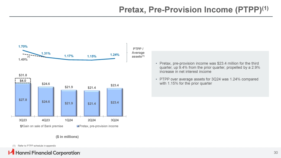 Noninterest Expense Continued focus on disciplined expense management. $20.4 $20.1 $21.6 $20.4 $20.9 Noninterest expense was $35.1 million for the third quarter, down 0.6% from the second quarter of 2024, primarily • Noninterest expense / Average assets 1.85% 1.89% 1.94% 1.87% 1.83% reflecting the absence of the second quarter $0.3 million branch consolidation charge Salaries and benefits expense increased by $0.4 million quarter - over - quarter primarily driven by the absence of $0.6 • $35.1 $4.4 $1.5 $3.8 $4.5 $35.3 $5.2 $1.7 $3.7 $4.3 $36.4 $4.8 $1.9 $3.6 $4.5 $35.2 $5.0 $2.0 $3.5 $4.6 $34.2 $3.9 $1.6 $3.5 $4.8 million of labor cost capitalization associated with the investment in a new loan origination system in 2Q24 2Q24 3Q24 Occupancy and equipment Professional Fees 3Q23 4Q23 1Q24 Salaries and employee benefits Data Processing All other expenses ($ in millions) 29