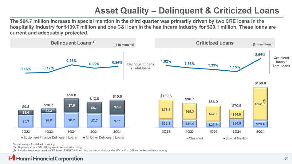 Pretax, Pre - Provision Income (PTPP) (1) • Pretax, pre - provision income was $23.4 million for the third quarter, up 9.4% from the prior quarter, propelled by a 2.9% increase in net interest income • PTPP over average assets for 3Q24 was 1.24% compared with 1.15% for the prior quarter $27.8 $24.6 $21.9 $21.4 $23.4 $4.0 $31.8 $24.6 $21.9 $21.4 $23.4 1.70% 1.31% 1.17% 1.15% 1.24% (1) 1.49% 1Q24 3Q23 4Q23 Gain on sale of Bank premise 2Q24 3Q24 Pretax, pre - provision income PTPP / Average assets (1) 30 ($ in millions) (1) Refer to PTPP schedule in appendix