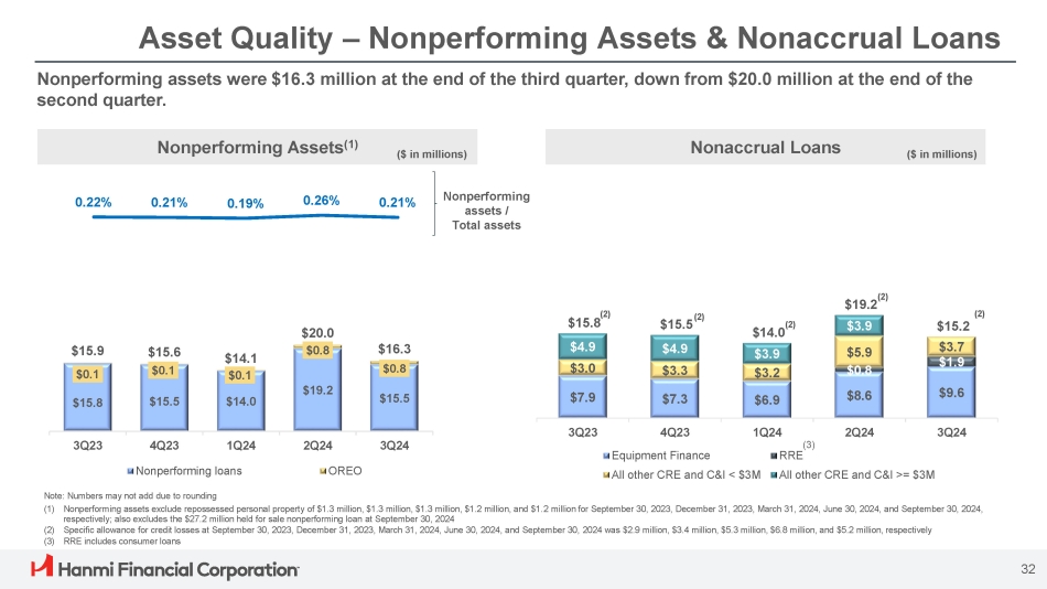Asset Quality – Delinquent & Criticized Loans Delinquent loans / Total loans $76.5 $65.3 $62.3 $36.9 $109.6 $96.7 $86.0 $70.9 $160.0 1.82% 1.56% 1.39% 1.15% 2.56% Classified Special Mention Delinquent Loans (1) Criticized Loans Criticized loans / Total loans The $94.7 million increase in special mention in the third quarter was primarily driven by two CRE loans in the hospitality industry for $109.7 million and one C&I loan in the healthcare industry for $20.1 million. These loans are current and adequately protected. $7.6 $6.1 $7.9 $9.5 $2.6 $10.3 $2.3 $28.4 $34.0 $23.7 $31.4 $33.1 $7.1 $7.7 $8.2 $8.0 $6.9 3Q24 2Q24 1Q24 4Q23 3Q23 3Q24 2Q24 1Q24 4Q23 3Q23 (2) $131.6 $15.8 $13.8 $15.0 0.16% 0.17% 0.26% 0.22% 0.24% Equipment Finance Delinquent Loans All Other Delinquent Loans Numbers may not add due to rounding (1) Represents loans 30 to 89 days past due and still accruing (2) Includes two special mention CRE loans of $109.7 million in the hospitality industry and a $20.1 million C&I loan in the healthcare industry 31 ($ in millions) ($ in millions)