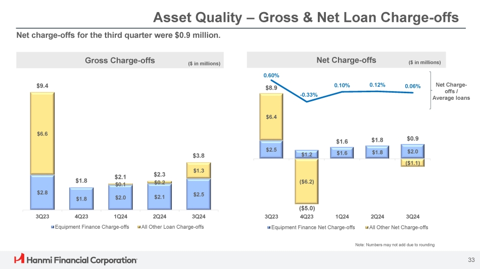 $15.8 $15.5 $14.0 $19.2 $15.5 $0.1 $0.1 $0.1 $15.9 $15.6 $14.1 $20.0 3Q23 4Q23 1Q24 Nonperforming loans 2Q24 3Q24 OREO Asset Quality – Nonperforming Assets & Nonaccrual Loans 0.22% 0.21% 0.19% 0.26% 0.21% Nonperforming assets / Total assets Nonperforming Assets (1) Nonaccrual Loans Nonperforming assets were $16.3 million at the end of the third quarter, down from $20.0 million at the end of the second quarter. ($ in millions) ($ in millions) Note: Numbers may not add due to rounding (1) Nonperforming assets exclude repossessed personal property of $1.3 million, $1.3 million, $1.3 million, $1.2 million, and $1.2 million for September 30, 2023, December 31, 2023, March 31, 2024, June 30, 2024, and September 30, 2024, respectively; also excludes the $27.2 million held for sale nonperforming loan at September 30, 2024 (2) Specific allowance for credit losses at September 30, 2023, December 31, 2023, March 31, 2024, June 30, 2024, and September 30, 2024 was $2.9 million, $3.4 million, $5.3 million, $6.8 million, and $5.2 million, respectively (3) RRE includes consumer loans $7.9 $7.3 $6.9 $8.6 $9.6 $4.9 $4.9 $16.3 $0.8 $3.3 $3.0 $0.8 $15.8 $15.5 $15.2 $3.7 $1.9 $3.9 (2) $14.0 $5.9 $3.9 $0.8 $3.2 $19.2 3Q23 4Q23 Equipment Finance 1Q24 2Q24 3Q24 RRE All other CRE and C&I < $3M All other CRE and C&I >= $3M 32 (3) (2) (2) (2) (2)