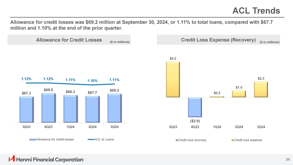 Asset Quality – Gross & Net Loan Charge - offs Gross Charge - offs Net Charge - offs Net Charge - offs / Average loans Net charge - offs for the third quarter were $0.9 million. ($ in millions) ($ in millions) $2.8 $1.8 $2.0 $2.1 $2.5 $6.6 $1.3 $9.4 $1.8 $2.1 $0.1 $2.3 $0.2 $3.8 3Q23 4Q23 1Q24 Equipment Finance Charge - offs 2Q24 3Q24 All Other Loan Charge - offs Note: Numbers may not add due to rounding $2.5 $1.2 $1.6 $1.8 $2.0 $6.4 ($6.2) ($1.1) $8.9 $1.6 $1.8 $0.9 0.60% - 0.33% 0.10% 0.12% 0.06% ($5.0) 4Q23 1Q24 3Q23 2Q24 3Q24 All Other Net Charge - offs Equipment Finance Net Charge - offs 33