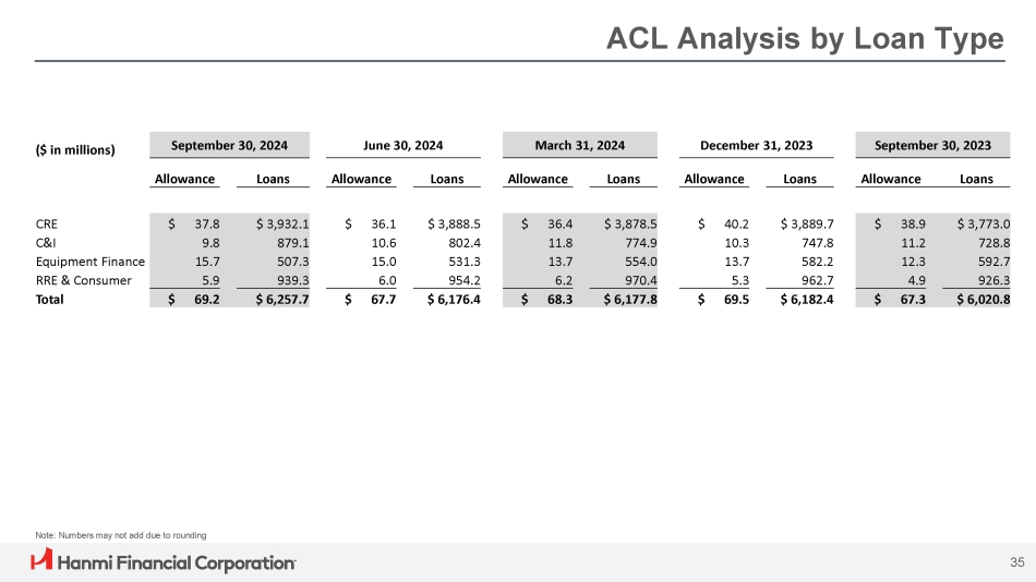 ACL Trends Allowance for credit losses was $69.2 million at September 30, 2024, or 1.11% to total loans, compared with $67.7 million and 1.10% at the end of the prior quarter. $67.3 $69.5 $68.3 $67.7 $69.2 1.12% 1.12% 1.11% 1.10% 1.11% 3Q23 4Q23 1Q24 2Q24 3Q24 Allowance for credit losses ACL to Loans $5.2 $0.2 $1.0 $2.3 ($2.9) 4Q23 3Q23 1Q24 2Q24 3Q24 Credit loss recovery Credit loss expense Allowance for Credit Losses Credit Loss Expense (Recovery) 34 ($ in millions) ($ in millions)