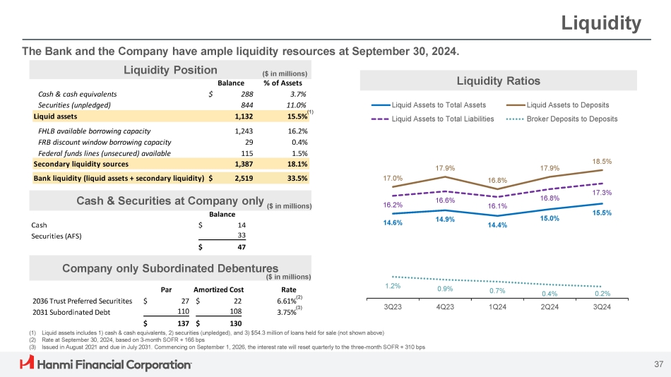 Balance % of Assets FHLB available borrowing capacity FRB discount window borrowing capacity Federal funds lines (unsecured) available 1,243 29 115 16.2% 0.4% 1.5% Secondary liquidity sources 1,387 18.1% Bank liquidity (liquid assets + secondary liquidity) $ 2,519 33.5% Liquidity The Bank and the Company have ample liquidity resources at September 30, 2024. (1) Liquid assets includes 1) cash & cash equivalents, 2) securities (unpledged), and 3) $54.3 million of loans held for sale (not shown above) (2) Rate at September 30, 2024, based on 3 - month SOFR + 166 bps (3) Issued in August 2021 and due in July 2031. Commencing on September 1, 2026, the interest rate will reset quarterly to the three - month SOFR + 310 bps Liquidity Position ($ in millions) 14.6% 14.9% 14.4% 15.0% 15.5% 17.0% 17.9% 16.8% 17.9% 18.5% 16.2% 16.6% 16.1% 16.8% 17.3% 1.2% 0.9% 0.7% 0.4% 0.2% 3Q23 4Q23 1Q24 2Q24 3Q24 3.7% $ 288 Cash & cash equivalents Liquid Assets to Deposits Liquid Assets to Total Assets 11.0% 844 Securities (unpledged) 1) Liquid Assets to Total Liabilities Broker Deposits to Deposits ( Liquid assets 1,132 15.5% Liquidity Ratios 37 Rate (2) 6.61% (3) 3.75% Amortized Cost $ 22 108 Par $ 27 110 2036 Trust Preferred Securitites 2031 Subordinated Debt $ 130 $ 137 Company only Subordinated Debentures ($ in millions) Cash & Securities at Company only ($ in millions) Balance Cash $ 14 Securities (AFS) 33 $ 47