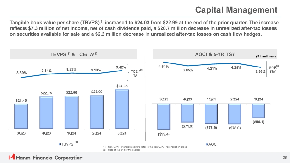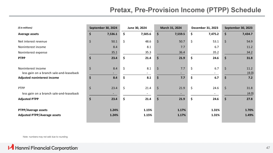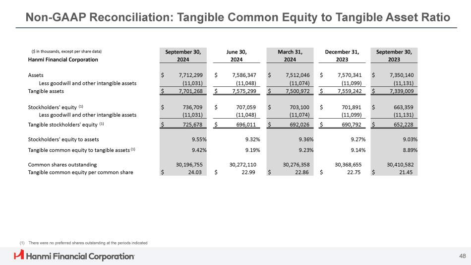 Non - GAAP Reconciliation: Tangible Common Equity to Tangible Asset Ratio 48 (1) There were no preferred shares outstanding at the periods indicated September 30, December 31, March 31, June 30, September 30, ($ in thousands, except per share data) 2023 2023 2024 2024 2024 Hanmi Financial Corporation $ 7,350,140 $ 7,570,341 $ 7,512,046 $ 7,586,347 $ 7,712,299 Assets (11,131) (11,099) (11,074) (11,048) (11,031) Less goodwill and other intangible assets $ 7,339,009 $ 7,559,242 $ 7,500,972 $ 7,575,299 $ 7,701,268 Tangible assets $ 663,359 $ 701,891 $ 703,100 $ 707,059 $ 736,709 Stockholders' equity (1) (11,131) (11,099) (11,074) (11,048) (11,031) Less goodwill and other intangible assets $ 652,228 $ 690,792 $ 692,026 $ 696,011 $ 725,678 Tangible stockholders' equity (1) 9.03% 9.27% 9.36% 9.32% 9.55% Stockholders' equity to assets 8.89% 9.14% 9.23% 9.19% 9.42% Tangible common equity to tangible assets (1) 30,410,582 30,368,655 30,276,358 30,272,110 30,196,755 Common shares outstanding $ 21.45 $ 22.75 $ 22.86 $ 22.99 $ 24.03 Tangible common equity per common share