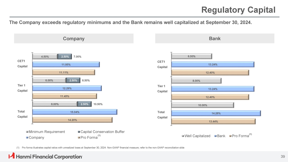 (1) Non - GAAP financial measure, refer to the non - GAAP reconciliation slides (2) Rate at the end of the quarter Capital Management Tangible book value per share (TBVPS) (1) increased to $24.03 from $22.99 at the end of the prior quarter. The increase reflects $7.3 million of net income, net of cash dividends paid, a $20.7 million decrease in unrealized after - tax losses on securities available for sale and a $2.2 million decrease in unrealized after - tax losses on cash flow hedges. 4.61% 3.85% 4.21% 4.38% 3.56% ($99.4) ($71.9) ($76.9) ($78.0) ($55.1) 3Q23 4Q23 1Q24 2Q24 3Q24 AOCI $21.45 $22.75 $22.86 $22.99 $24.03 8.89% 9.14% 9.23% 9.19% 9.42% 3Q23 4Q23 1Q24 2Q24 3Q24 TBVPS TBVPS (1) & TCE/TA (1) AOCI & 5 - YR TSY 5 - YR TSY (2) TCE / TA ($ in millions) (1) 38 (1)