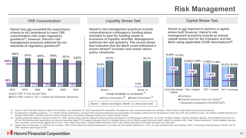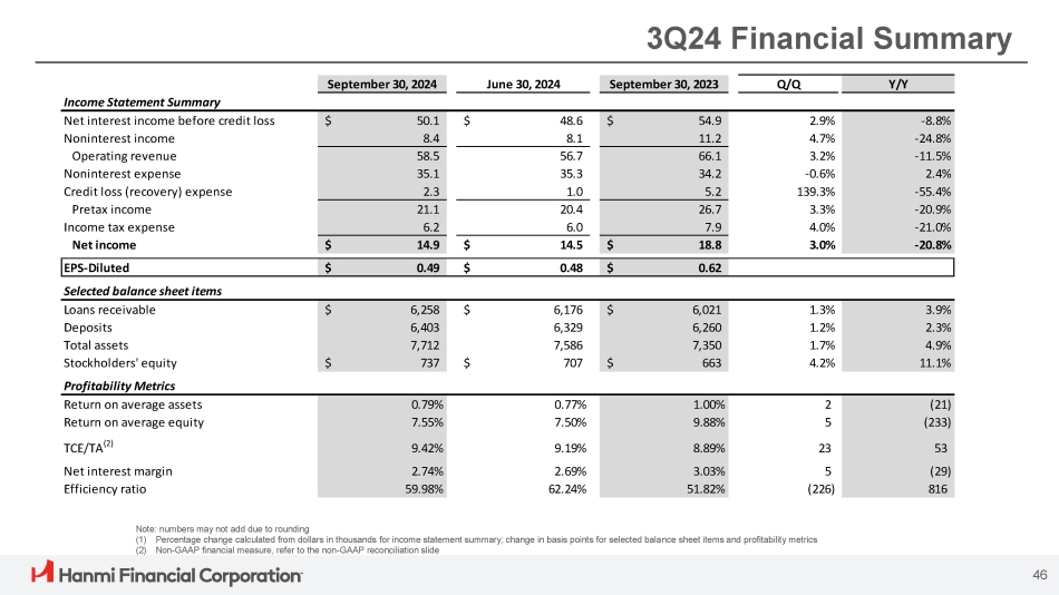 Risk Management CRE Concentration Hanmi has not exceeded the supervisory criteria to be considered to have CRE concentration risk under regulatory guidance (1) ; however, Hanmi’s risk management practices address the six elements of regulatory guidance (2) (1) Source: FDIC Financial Institution Letters (FIL - 64 - 2023), as of December 18, 2023; also total ADC (Acquisition, Development, and Construction) loans are well below 100% of Bank’s total capital for all periods presented (2) Six elements of regulatory guidance – (1) maintain strong capital levels, (2) ensure that credit loss allowances are appropriate, (3) manage construction and development (C&D) and CRE loan portfolios closely, (4) maintain updated financial and analytical information, (5) bolster the loan workout infrastructure, (6) maintain adequate liquidity and diverse funding sources (3) Liquidity stress test based on deposits at March 31, 2024. Severe stress scenario makes the following stress assumptions: (a) 25% deposit outflow over 12 months, (b) Bank unable to replace wholesale deposits, and (c) federal fund lines cut off, and the following relief assumptions: (a) loan - and - securities based FHLB capacity adjusted down for increased haircut, and (b) Bank’s assets (loans) are sold to abate the liquidity crisis. Under “Stress Assumption”, funds available represent cash, securities, and borrowing capacity from FHLB. Under “Relief Assumption”, funds available represent funds under “Stress Assumption” and cash proceeds from loans sale (4) Capital ratios at December 31, 2023 for the Company. 2024 CCAR makes the following assumptions: (a) trough real GDP growth declining by 11.6%, (b) peak unemployment rate reaching 10.0%, (c) housing prices declining by 36.0%, and (d) CRE valuations declining by 40.0% 38% 14% 13% 14% 18% 14% 396% 376% 369% 369% 357% 343% 300% 50% 2018 2019 2020 2021 2022 2023 NOO CRE 3 - Year Growth Rate NOO CRE Loans to Tier 1 Capital and Allowable Allowance Capital Stress Test Hanmi is not required to perform a capital stress test; however, Hanmi’s risk management practices include an annual capital stress test for the Company and the Bank using applicable CCAR assumptions (4) 14.95% 14.70% 12.20%11.80% 11.86% 11.40% 10.37%10.10% 8.00% 6.00% 4.50% 4.00% CET 1 Capital Tier 1 Leverage Total Risk - based Tier 1 Capital Capital Company Severely Adverse Case (+2 Years) Adequately Capitalized (CCAR/DFAST) Liquidity Stress Test Hanmi’s risk management practices include comprehensive contingency funding plans intended to plan for funding needs in scenarios of liquidity shortfall. Management performs the test quarterly. The recent stress test indicates that the Bank could withstand a severe stress (3) scenario and remain above policy minimums 25.8% 4.4% 32.2% 29.7% Month 1 Month 12 (3) Funds Available (% of Assets) Stress Assumption (3) Relief Assumption (3) 45 Month 1: Stress test begins; Month 12: Stress test ends (4)