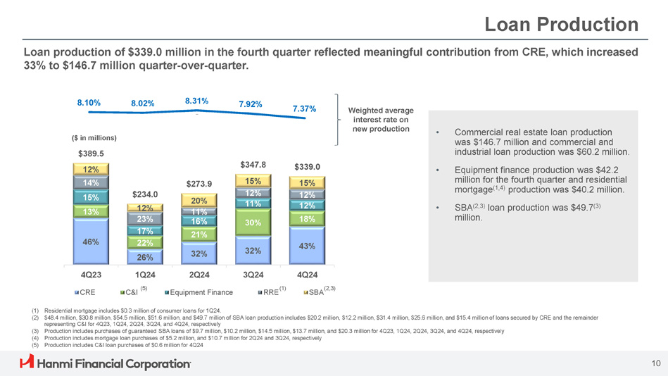 Hanmi Franchise at a Glance Loans $6.3B Deposits $6.4B TCE/TA (2) Ratio 9.41% Second Largest Korean - American Bank in the U.S. • Founded in 1982 in Los Angeles, as the first Korean - American bank • 31 full - service branches and 8 loan production offices across 9 states • Focused on MSAs with high Asian - American and multi - ethnic populations • Strong track record of growth • Well capitalized, significantly above regulatory requirements (1) CAGR based on the average loan growth between 2013, when new executive management was appointed, and 2023 (2) Non - GAAP financial measure; refer to the non - GAAP reconciliation slide Loan Growth (1) 9.9% TBVPS (2) $23.88 As of 4Q24 Total Assets $7.7B Experienced Bankers with Deep Community Ties 3 2 1 1 1 1 5 1 1 Branch Loan Production Office (LPO) 1 20 2 5