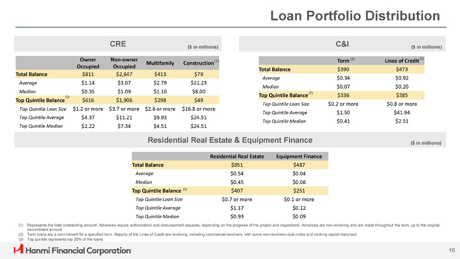 CRE Portfolio Geographical Exposure CRE Composition by State $3,950 Multifamily by State $412 Construction by State $79 Owner Occupied by State $811 Investor (Non - owner Occupied) by State $2,647 California – $2,510 64% Texas – $388 10% New York – $257 7% Illinois – $103 3% Other – $692 16% California – $205 50% Texas – $100 24% New York – $80 19% Illinois – $12 3% Other – $15 4% California – $38 48% New York – $17 22% Other – $24 30% California – $439 54% New York – $8 1% Texas – $53 7% Illinois – $13 2% Other – $298 36% California – $1,828 69% 15 Texas – $234 9% New York – $152 6% Illinois – $78 3% Other – $355 13% ($ in millions) ($ in millions)