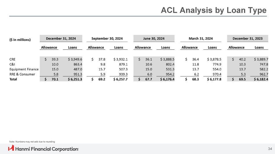 ACL Trends Allowance for credit losses was $70.1 million at December 31, 2024, or 1.12% to total loans, compared with $69.2 million and 1.11% at the end of the prior quarter. $69.5 $68.3 $67.7 $69.2 $70.1 1.12% 1.11% 1.10% 1.11% 1.12% 4Q23 1Q24 2Q24 3Q24 4Q24 Allowance for credit losses ACL to Loans ($2.9) $0.2 $1.0 $2.3 $0.9 4Q23 1Q24 2Q24 3Q24 4Q24 Credit loss recovery Credit loss expense Allowance for Credit Losses Credit Loss Expense (Recovery) 33 ($ in millions) ($ in millions)