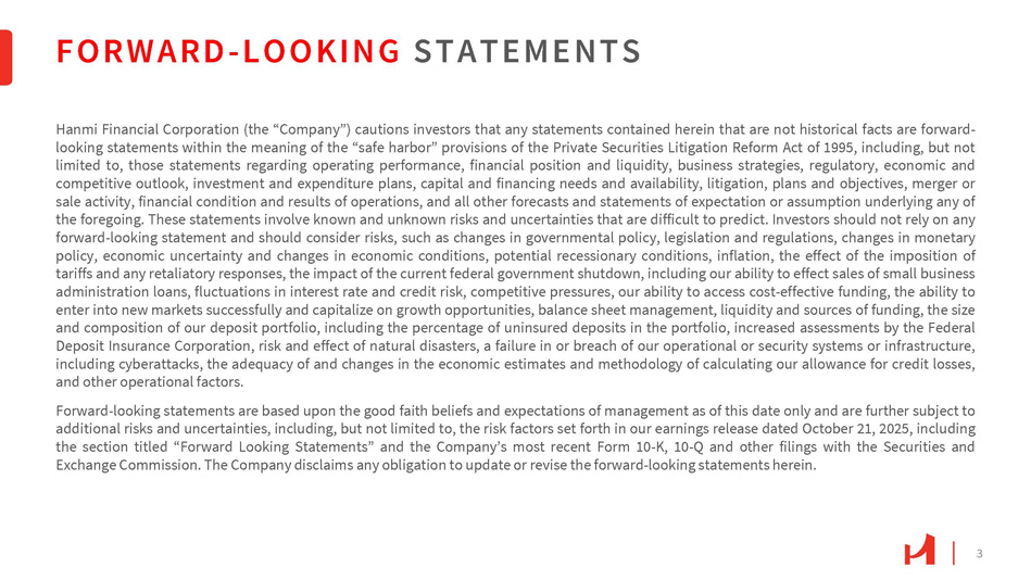 3 FORWARD - LOOKING STATEMENTS Hanmi Financial Corporation (the “Company”) cautions investors that any statements contained herein that are not historical facts are forward - looking statements within the meaning of the “safe harbor” provisions of the Private Securities Litigation Reform Act of 1995 , including, but not limited to, those statements regarding operating performance, financial position and liquidity, business strategies, regulatory, economic and competitive outlook, investment and expenditure plans, capital and financing needs and availability, litigation, plans and objectives, merger or sale activity, financial condition and results of operations, and all other forecasts and statements of expectation or assumption underlying any of the foregoing . These statements involve known and unknown risks and uncertainties that are difficult to predict . Investors should not rely on any forward - looking statement and should consider risks, such as changes in governmental policy, legislation and regulations, changes in monetary policy, economic uncertainty and changes in economic conditions, potential recessionary conditions, inflation, the effect of the imposition of tariffs and any retaliatory responses, the impact of the current federal government shutdown, including our ability to effect sales of small business administration loans, fluctuations in interest rate and credit risk, competitive pressures, our ability to access cost - effective funding, the ability to enter into new markets successfully and capitalize on growth opportunities, balance sheet management, liquidity and sources of funding, the size and composition of our deposit portfolio, including the percentage of uninsured deposits in the portfolio, increased assessments by the Federal Deposit Insurance Corporation, risk and effect of natural disasters, a failure in or breach of our operational or security systems or infrastructure, including cyberattacks, the adequacy of and changes in the economic estimates and methodology of calculating our allowance for credit losses, and other operational factors . Forward - looking statements are based upon the good faith beliefs and expectations of management as of this date only and are further subject to additional risks and uncertainties, including, but not limited to, the risk factors set forth in our earnings release dated October 21 , 2025 , including the section titled “Forward Looking Statements” and the Company’s most recent Form 10 - K, 10 - Q and other filings with the Securities and Exchange Commission . The Company disclaims any obligation to update or revise the forward - looking statements herein .