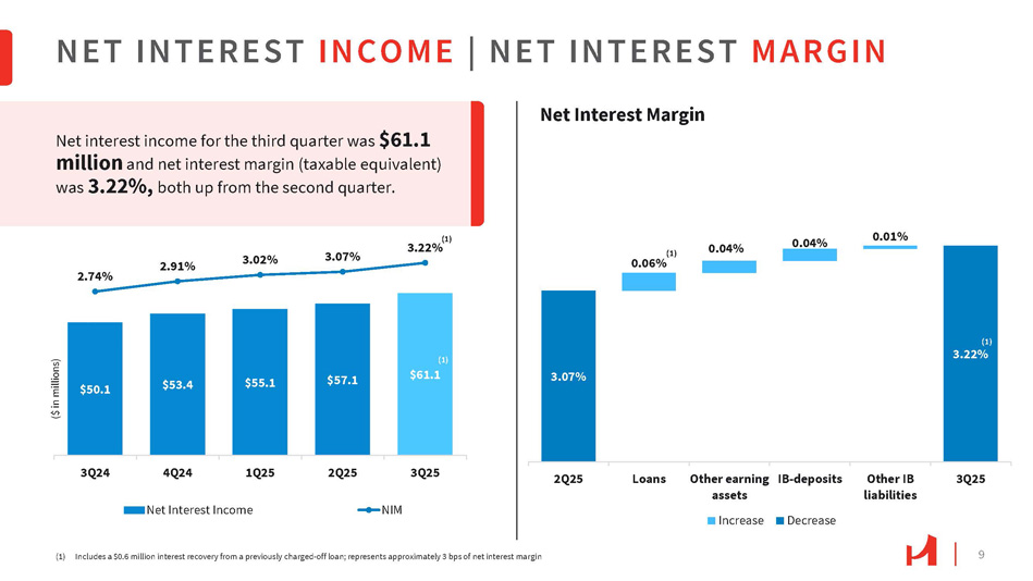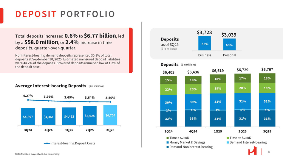 $4,704 $4,625 $4,462 $4,361 $4,397 3Q25 2Q25 1Q25 4Q24 3Q24 4.27% 3.96% 3.69% 3.64% 3.56% Interest - bearing Deposit Costs Average Interest - bearing Deposits DEPOSIT PORTFOLIO Total deposits increased 0.6% to $6.77 billion , led by a $58.0 million , or 2.4% , increase in time deposits, quarter - over - quarter. Noninterest - bearing demand deposits represented 30.8% of total deposits at September 30, 2025. Estimated uninsured deposit liabilities were 44.2% of the deposits. Brokered deposits remained low at 1.3% of the deposit base. Note: Numbers may not add due to rounding Deposits $6,436 $6,403 16% 15% 20% 22% $6,767 $6,729 $6,619 18% 17% 18% 19% 20% 19% 31% 31% 31% 30% 30% 1% 1% 1% 1% 1% 31% 31% 31% 33% 32% 3Q25 2Q25 Time <= $250K 1Q25 4Q24 3Q24 Time > $250K Demand Interest - bearing Money Market & Savings Demand Noninterest - bearing ($ in millions) Deposits as of 3Q25 ($ in millions) $3,728 Business Personal $3,039 45% 8 55% ($ in millions)