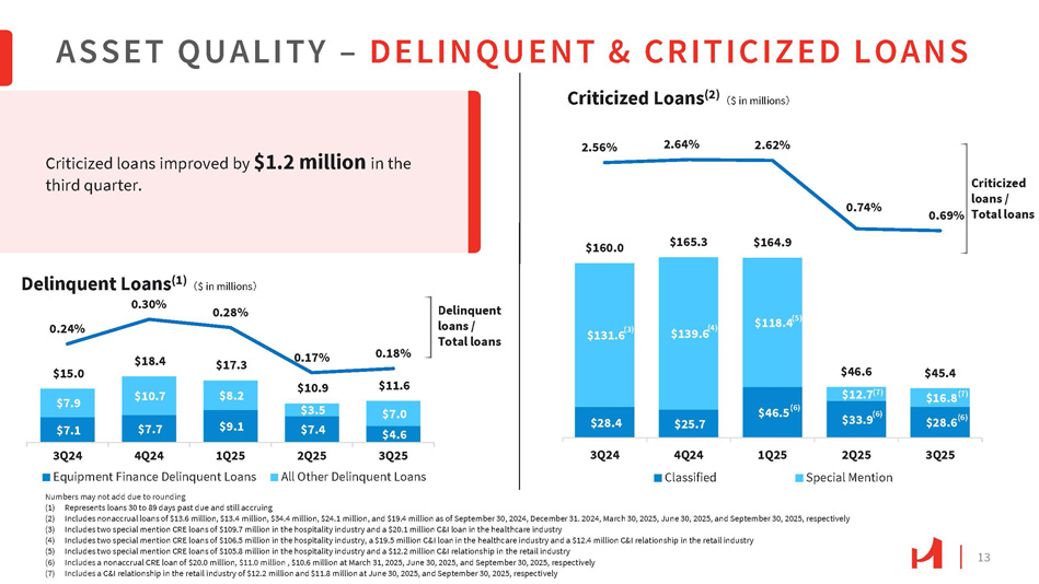 NONINTEREST EXPENSE 12 (1) Includes a $1.6 million and a $0.6 million gain from the sale of an OREO property in 4Q24 and 2Q25, respectively. Noninterest expense was $37.4 million for the third quarter, up 3% from the second quarter, primarily due to the gain on OREO asset in the second quarter. $20.9 $20.5 $21.0 $22.1 $22.2 $35.1 $4.4 $1.5 $3.8 $4.5 $35.0 $4.2 $1.5 $3.8 $4.5 $37.4 $4.8 $2.0 $3.9 $4.5 1.85% 1.82% 1.86% 1.89% 1.90% 3Q24 4Q24 Salaries and employee benefits Professional Fees 1Q25 Occupancy and equipment All other expenses $34.5 $3.9 (1) $1.8 $3.8 $4.5 $36.3 $4.5 (1) $1.7 $3.7 $4.3 2Q25 3Q25 Data Processing Noninterest expense / Average assets ($ in millions)