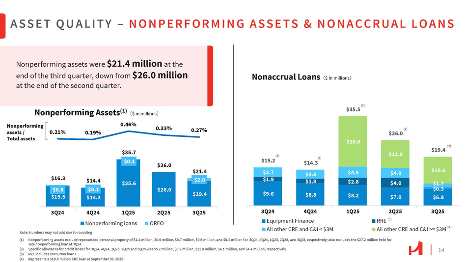 13 $7.7 $9.1 $10.7 $8.2 $15.0 $7.9 $7.1 $18.4 $17.3 $10.9 $3.5 $7.4 $11.6 $7.0 $4.6 0.24% 0.30% 0.28% 0.17% 0.18% 2Q25 3Q25 All Other Delinquent Loans 3Q24 4Q24 1Q25 Equipment Finance Delinquent Loans Numbers may not add due to rounding ASSET QUALITY – DELINQUENT & CRITICIZED LOANS Delinquent loans / Total loans $139.6 $160.0 $165.3 $164.9 2.56% 2.64% 2.62% 0.74% Criticized loans / 0.69% Total loans $131.6 (3) (1) Represents loans 30 to 89 days past due and still accruing (2) Includes nonaccrual loans of $13.6 million, $13.4 million, $34.4 million, $24.1 million, and $19.4 million as of September 30, 2024, December 31. 2024, March 30, 2025, June 30, 2025, and September 30, 2025, respectively (3) Includes two special mention CRE loans of $109.7 million in the hospitality industry and a $20.1 million C&I loan in the healthcare industry (4) Includes two special mention CRE loans of $106.5 million in the hospitality industry, a $19.5 million C&I loan in the healthcare industry and a $12.4 million C&I relationship in the retail industry (5) Includes two special mention CRE loans of $105.8 million in the hospitality industry and a $12.2 million C&I relationship in the retail industry (6) Includes a nonaccrual CRE loan of $20.0 million, $11.0 million , $10.6 million at March 31, 2025, June 30, 2025, and September 30, 2025, respectively (7) Includes a C&I relationship in the retail industry of $12.2 million and $11.8 million at June 30, 2025, and September 30, 2025, respectively (4) Criticized loans improved by $1.2 million in the third quarter. Delinquent Loans (1) 㸦 $ in millions 㸧 Criticized Loans (2) 㸦 $ in millions 㸧 $118.4 (5) $45.4 $46.6 $16.8 (7) $28.6 (6) $12.7 (7) $33.9 (6) $46.5 (6) $25.7 $28.4 3Q25 2Q25 Special Mention 1Q25 4Q24 Classified 3Q24