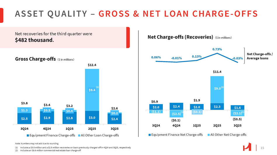 14 Nonperforming assets were $21.4 million at the end of the third quarter, down from $26.0 million at the end of the second quarter. $15.5 $14.3 $35.6 $26.0 $19.4 $0.8 $0.1 $0.1 $2.0 $16.3 $14.4 $35.7 $26.0 $21.4 0.21% 0.19% 0.46% 0.33% 0.27% 3Q25 2Q25 OREO 3Q24 4Q24 1Q25 Nonperforming loans Note: Numbers may not add due to rounding ASSET QUALITY – NONPERFORMING ASSETS & NONACCRUAL LOANS (1) Nonperforming assets exclude repossessed personal property of $1.2 million, $0.6 million, $0.7 million, $0.6 million, and $0.4 million for 3Q24, 4Q24, 1Q25, 2Q25, and 3Q25, respectively; also excludes the $27.2 million held for sale nonperforming loan at 3Q24. (2) Specific allowance for credit losses for 3Q24, 4Q24, 1Q25, 2Q25 and 3Q25 was $5.2 million, $6.2 million, $11.8 million, $4.1 million, and $4.4 million, respectively (3) RRE includes consumer loans (4) Represents a $10.6 million CRE loan at September 30, 2025 (2) $35.5 1Q25 3Q24 4Q24 Equipment Finance All other CRE and C&I < $3M (2) $19.4 $11.0 $20.0 (2) $14.3 (2) $15.2 $10.6 $1.7 $0.3 $6.8 $4.0 $4.0 $7.0 $4.5 $2.8 $8.2 $3.6 $1.9 $8.8 $3.7 $1.9 $9.6 (2) $26.0 2Q25 3Q25 RRE (3) All other CRE and C&I >= $3M (4) Nonperforming Assets (1) 㸦 $ in millions 㸧 Nonaccrual Loans 㸦 $ in millions 㸧 Nonperforming assets / Total assets