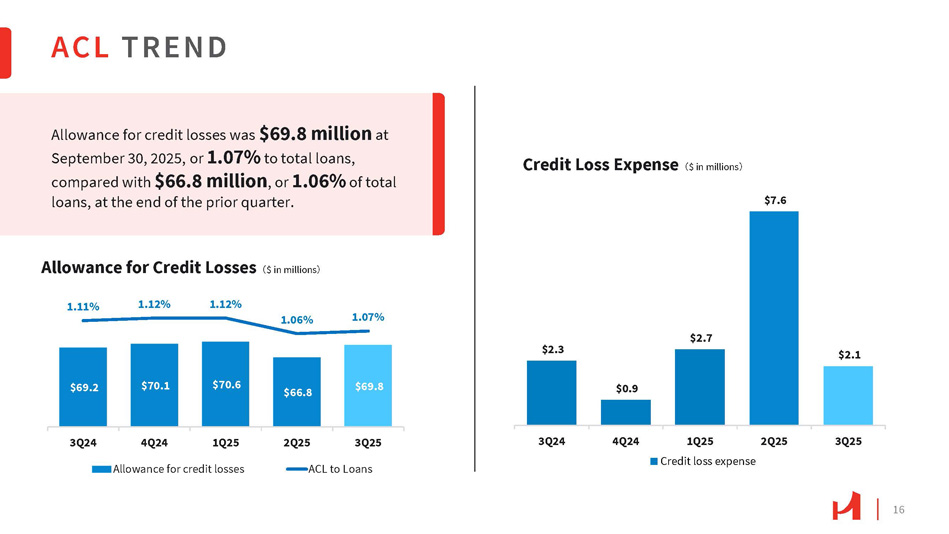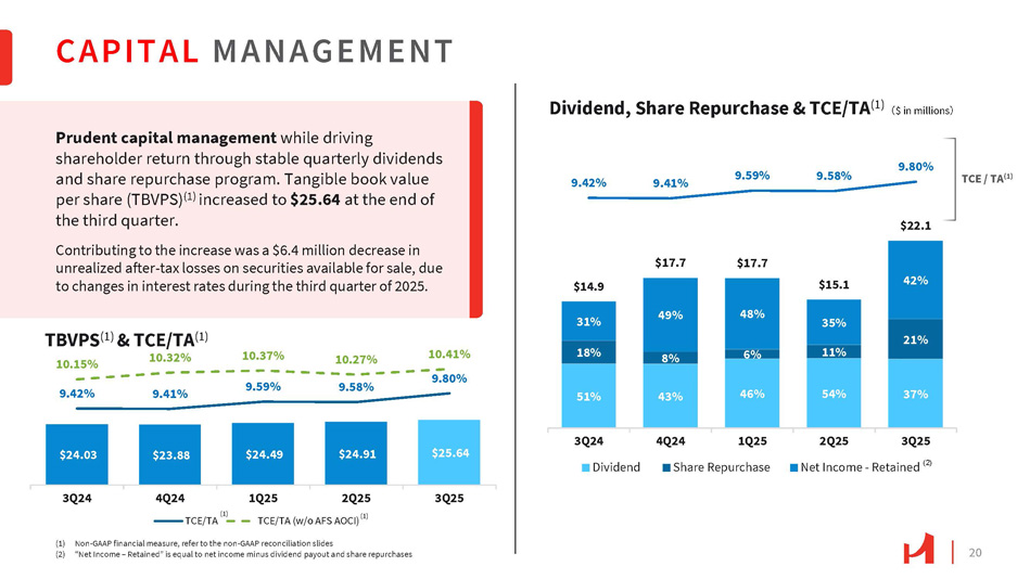 20 42% $14.9 $17.7 $17.7 $15.1 $22.1 9.42% 9.41% 9.59% 9.58% 9.80% 3Q24 Dividend 4Q24 1Q25 Share Repurchase 2Q25 3Q25 Net Income - Retained (2) $24.03 $23.88 $24.49 $24.91 $25.64 3Q24 4Q24 3Q25 (1) TCE/TA 1Q25 2Q25 TCE/TA (w/o AFS AOCI) (1) (1) Non - GAAP financial measure, refer to the non - GAAP reconciliation slides (2) “Net Income – Retained” is equal to net income minus dividend payout and share repurchases CAPITAL MANAGEMENT TCE / TA (1) Prudent capital management while driving shareholder return through stable quarterly dividends and share repurchase program. Tangible book value per share (TBVPS) (1) increased to $25.64 at the end of the third quarter. Contributing to the increase was a $6.4 million decrease in unrealized after - tax losses on securities available for sale, due to changes in interest rates during the third quarter of 2025. 35% 48% 49% 31% 21% 11% 6% 8% 18% 10.41% 10.27% 10.37% TBVPS (1) & TCE/TA (1) 10.15% 10.32% 37% 54% 46% 43% 51% 9.80% 9.58% 9.59% 9.42% 9.41% Dividend, Share Repurchase & TCE/TA (1) 㸦 $ in millions 㸧