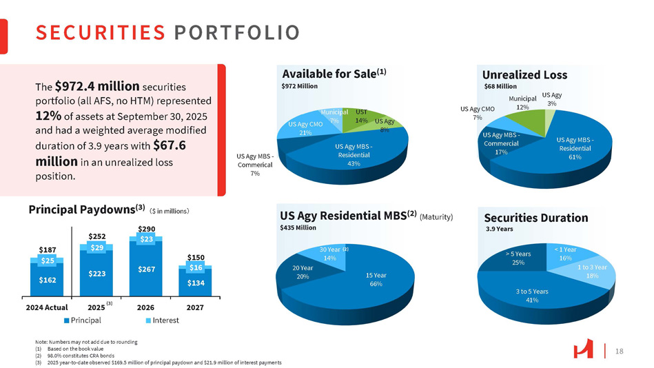 18 15 Year 66% 20 Year 20% SECURITIES PORTFOLIO $162 $223 $267 $134 $25 $29 $23 $16 $187 $252 $290 $150 2024 Actual 2027 2026 Interest 3% US Agy MBS - Residential 61% US Agy MBS - Commercial 17% US Agy CMO 7% Municipal 12% US Agy 8% US Agy MBS - Residential 43% US Agy MBS - Commerical 7% US Agy CMO 21% Municipal UST 7% 14% Available for Sale (1) $972 Million < 1 Year 16% 1 to 3 Year 18% 3 to 5 Years 41% > 5 Years 25% Unrealized Loss $68 Million US Agy Securities Duration 3.9 Years $435 Million 30 Year (2) 14% 2025 (3) Principal Note: Numbers may not add due to rounding (1) Based on the book value (2) 98.0% constitutes CRA bonds (3) 2025 year - to - date observed $169.5 million of principal paydown and $21.9 million of interest payments The $972.4 million securities portfolio (all AFS, no HTM) represented 12% of assets at September 30, 2025 and had a weighted average modified duration of 3.9 years with $67.6 million in an unrealized loss position. Principal Paydowns (3) 㸦 $ in millions 㸧 US Agy Residential MBS (2) (Maturity)