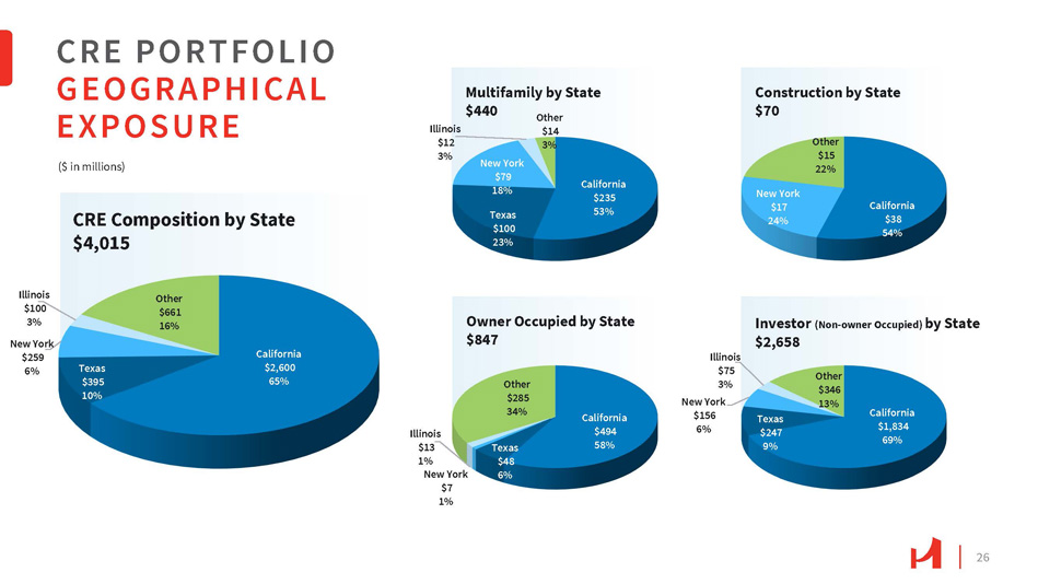 LOAN PORTFOLIO DIVERSIFICATION (1) $113.3 million, or 2.8%, and $27.7 million, or 0.7% of the CRE portfolio are unguaranteed and guaranteed SBA loans, respectively (2) $62.9 million, or 6.0%, and $59.6 million, or 5.7%, of the C&I portfolio are unguaranteed and guaranteed SBA loans, respectively Retail 28% Hospitality 20% Office 13% Industrial 12% Multifamily 10% Gas Station 5% Mixed Use 3% Construction 2% Other 7% CRE Portfolio (1) $4,015M Manufacturing 30% Finance & Insurance 16% 6% Wholesale Tra d R e etail Trade 5% Healthcare 4% Real Estate Rental & Leasing 2% Other 37% C&I Portfolio (2) $1,052M • CRE (1) represents 62% of the total portfolio • C&I (2) represents 16% of the total portfolio. 25