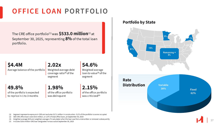 30 Residential Portfolio RRE Portfolio RESIDENTIAL REAL ESTATE PORTFOLIO The RRE (1) portfolio was $1.04 billion at September 30, 2025, representing 16% of the total loan portfolio. Our conservative underwriting policy focuses on high - quality mortgage originations with maximum Loan - to - Value (LTV) ratios between 60% and 70%, maximum Debt - to - Income (DTI) ratios of 43% and minimum FICO scores of 680. 25.7% Fixed Non - QM 92% (3) Jumbo Non - QM 6% (4) QM 2% (2) (1) RRE includes $1.1 million of Home Equity Line of Credit (HELOC) and $6.7 million in consumer loans (2) QM loans conform to the Ability - to - Repay (ATR) rules/requirements of CFPB (3) Non - QM loans do not conform to the CFPB Dodd - Frank Act (4) Jumbo Non - QM loan amounts exceed FHFA limits, but generally conform to the ATR/QM rules Residential Real Estate Portfolio 74.3% Variable 0.64% 0.23% Total 30 - 59 days delinquencies delinquency category 9.8% 90.2% Reset within the Reset after next 12 months 12 months 0.38% 60 - 89 days delinquency category $0.3M / 0.03% on nonaccrual status at September 30, 2025 Percentage of Portfolio