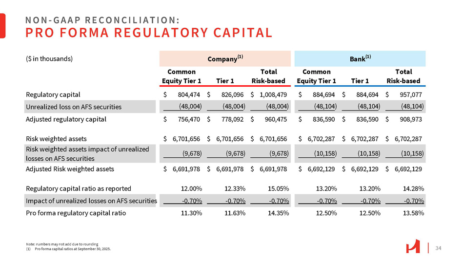 33 NON - G A A P R E C O N C I L I A T I O N : TANGIBLE COMMON EQUITY TO TANGIBLE ASSET RATIO (1) There were no preferred shares outstanding at the periods indicated September 30, December 31, March 31, June 30, September 30, 2024 2024 2025 2025 2025 Hanmi Financial Corporation 7,712,299 $ 7,677,925 $ 7,729,035 $ 7,862,363 $ 7,856,731 $ Assets (11,031) (11,031) (11,031) (11,031) (11,031) Less goodwill and other intangible assets $ 7,701,268 $ 7,666,894 $ 7,718,004 $ 7,851,332 $ 7,845,700 Tangible assets 736,709 $ 732,174 $ 751,485 $ 762,834 $ 779,550 $ Stockholders' equity (1) (11,031) (11,031) (11,031) (11,031) (11,031) Less goodwill and other intangible assets 725,678 $ 721,143 $ 740,454 $ 751,803 $ 768,519 $ (1) Tangible stockholders' equity 55,790 70,342 60,035 54,541 48,004 Add AFS securities AOCI $ 781,468 $ 791,485 $ 800,489 $ 806,344 $ 816,523 Tangible stockholders' equity without AFS securities AOCI (1) 9.55% 9.54% 9.72% 9.70% 9.92% Stockholders' equity to assets 9.42% 9.41% 9.59% 9.58% 9.80% Tangible common equity to tangible assets (TCE/TA) (1) 10.15% 10.32% 10.37% 10.27% 10.41% TCE/TA (w/o AFS securities AOCI) (1) 30,196,755 30,195,999 30,233,514 30,176,568 29,975,371 Common shares outstanding 24.03 $ 23.88 $ 24.49 $ 24.91 $ 25.64 $ Tangible common equity per common share (In thousands, except share, per share data and ratios)