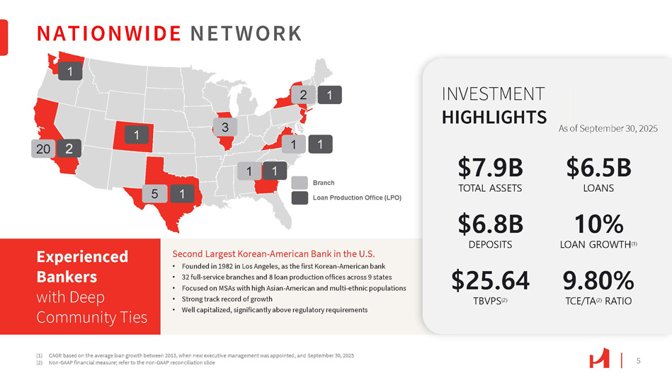 Second Largest Korean - American Bank in the U.S. • Founded in 1982 in Los Angeles, as the first Korean - American bank • 32 full - service branches and 8 loan production offices across 9 states • Focused on MSAs with high Asian - American and multi - ethnic populations • Strong track record of growth • Well capitalized, significantly above regulatory requirements Experienced Bankers with Deep Community Ties 3 1 1 1 1 5 1 NATIONWIDE NETWORK 1 2 Branch Loan Production Office (LPO) 1 20 2 TOTAL ASSETS $6.5B LOANS $6.8B DEPOSITS 10% LOAN GROWTH (1) 9.80% TCE/TA (2) RATIO $25.64 TBVPS (2) INVESTMENT HIGHLIGHTS $7.9B As of September 30, 2025 (1) CAGR based on the average loan growth between 2013, when new executive management was appointed, and September 30, 2025 (2) Non - GAAP financial measure; refer to the non - GAAP reconciliation slide 5 1