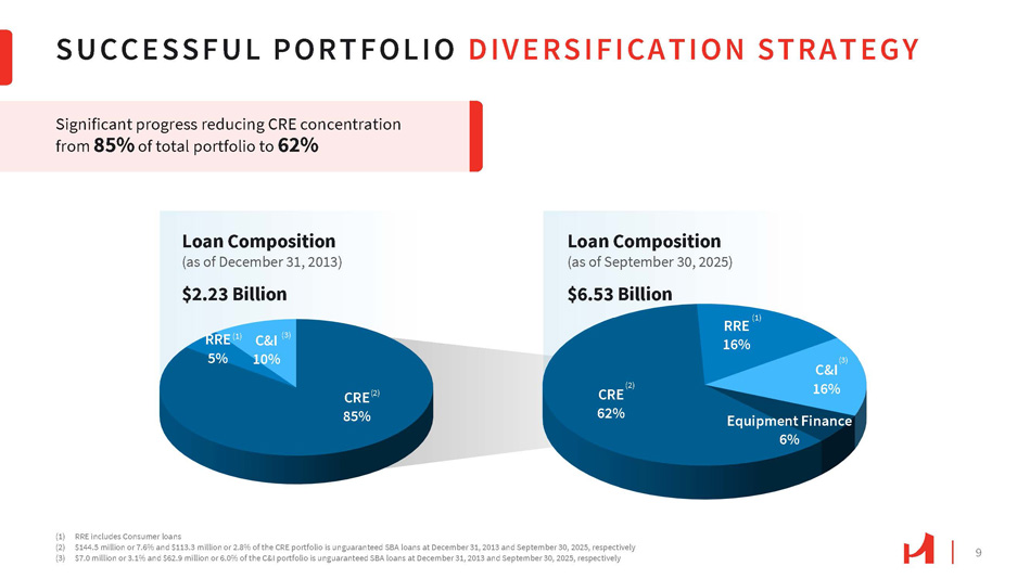 RRE (1) 5% CRE (2) 85% C&I (3) 10% Equipment Finance 6% (2) CRE 62% (3) C&I 16% Loan Composition (as of December 31, 2013) $2.23 Billion Loan Composition (as of September 30, 2025) $6.53 Billion RRE (1) 16% SUCCESSFUL PORTFOLIO DIVERSIFICATION STRATEGY Significant progress reducing CRE concentration from 85% of total portfolio to 62% (1) RRE includes Consumer loans (2) $144.5 million or 7.6% and $113.3 million or 2.8% of the CRE portfolio is unguaranteed SBA loans at December 31, 2013 and September 30, 2025, respectively (3) $7.0 million or 3.1% and $62.9 million or 6.0% of the C&I portfolio is unguaranteed SBA loans at December 31, 2013 and September 30, 2025, respectively 9